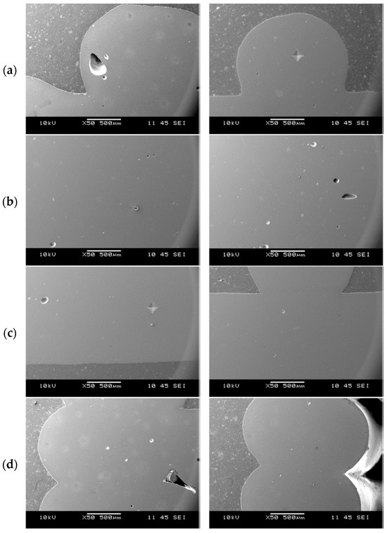For the ceramic filters (Figure 10), analysis conducted in all four inspection regions (Figure 6) revealed the presence of minor structural discontinuities in the form of closed pores, which may arise from incomplete degassing of the ceramic paste prior to printing. Furthermore, the interface between successive transverse layers is continuous. This is important because, in this zone, adjacent material layers meet at 90°, and the interface width corresponds to the diameter of the nozzle used in the 3D-printing process. Such regions may serve as sites for the accumulation of residual stresses generated by material shrinkage during drying and sintering. It should also be noted that the cross-section of an individual printed layer is approximately circular, which can lead to local notch formation at layer junctions (Figure 10d). These discontinuities may constitute potential sites for crack initiation and propagation under mechanical and thermal loading.