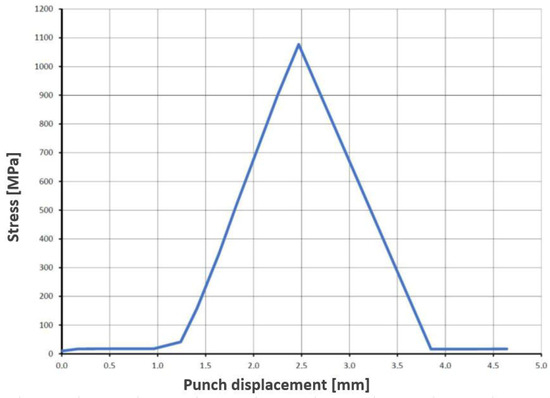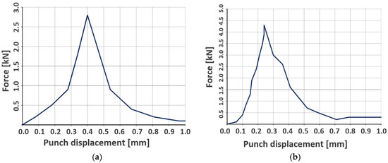 During compressive strength analyses of solid specimens fabricated by robocasting, it was observed that the applied load increases linearly up to the compressive strength limit. Once this limit is exceeded, catastrophic failure occurs, resulting in an abrupt drop in the recorded load. A representative load–displacement curve is shown in Figure 13. Such a response is characteristic of brittle ceramic materials.