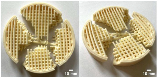 Compressive strength tests were performed using a testing machine with a maximum load capacity of 400 kN, equipped with a mechanism for controlling the crosshead speed and fitted with compression platens of diameters D = 22 mm and D = 40 mm and a speed was set to 1 mm/min. The tests employed robocast solid cylindrical specimens with dimensions D = 11 mm, h = 11 mm and D = 15 mm, h = 15 mm, designated SC (solid cylinder) ceramic filters designated as FP22 for a platen diameter of 22 mm and FP40 for a platen diameter of 40 mm were used for the tests. Representative images of the filters prepared for bending tests are shown in Figure 5.