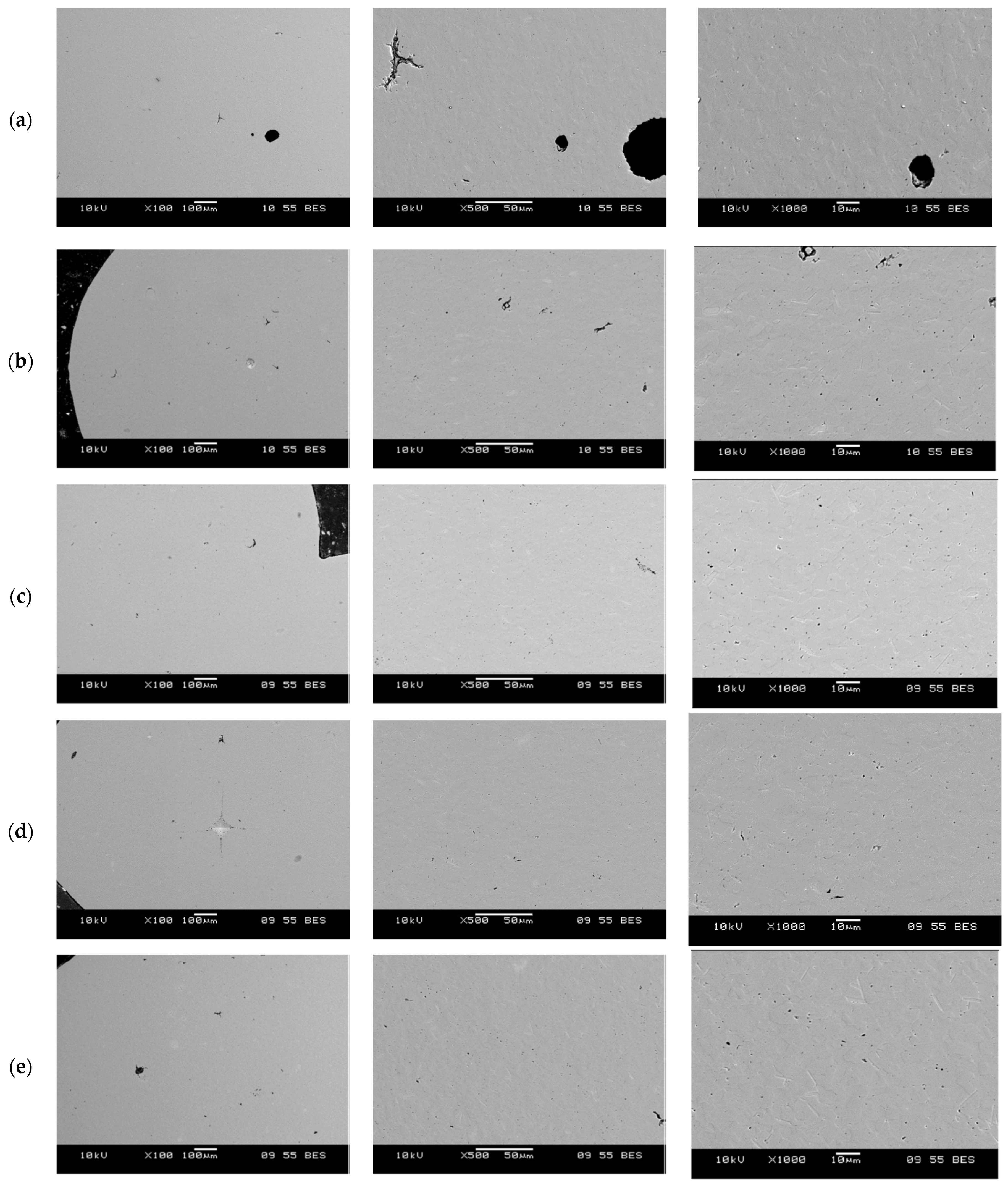 - five ceramic filters, examined at different locations across the transverse cross-section—top (FT), middle (FM), bottom (FB), and side (FS); see Figure 6—in backscattered electron (BSE) and secondary electron (SEI) modes, at an accelerating voltage of 10 kV and magnifications in the range of 50–1000×. In addition, macrographs of selected filter regions were acquired at 50× in SEI mode.