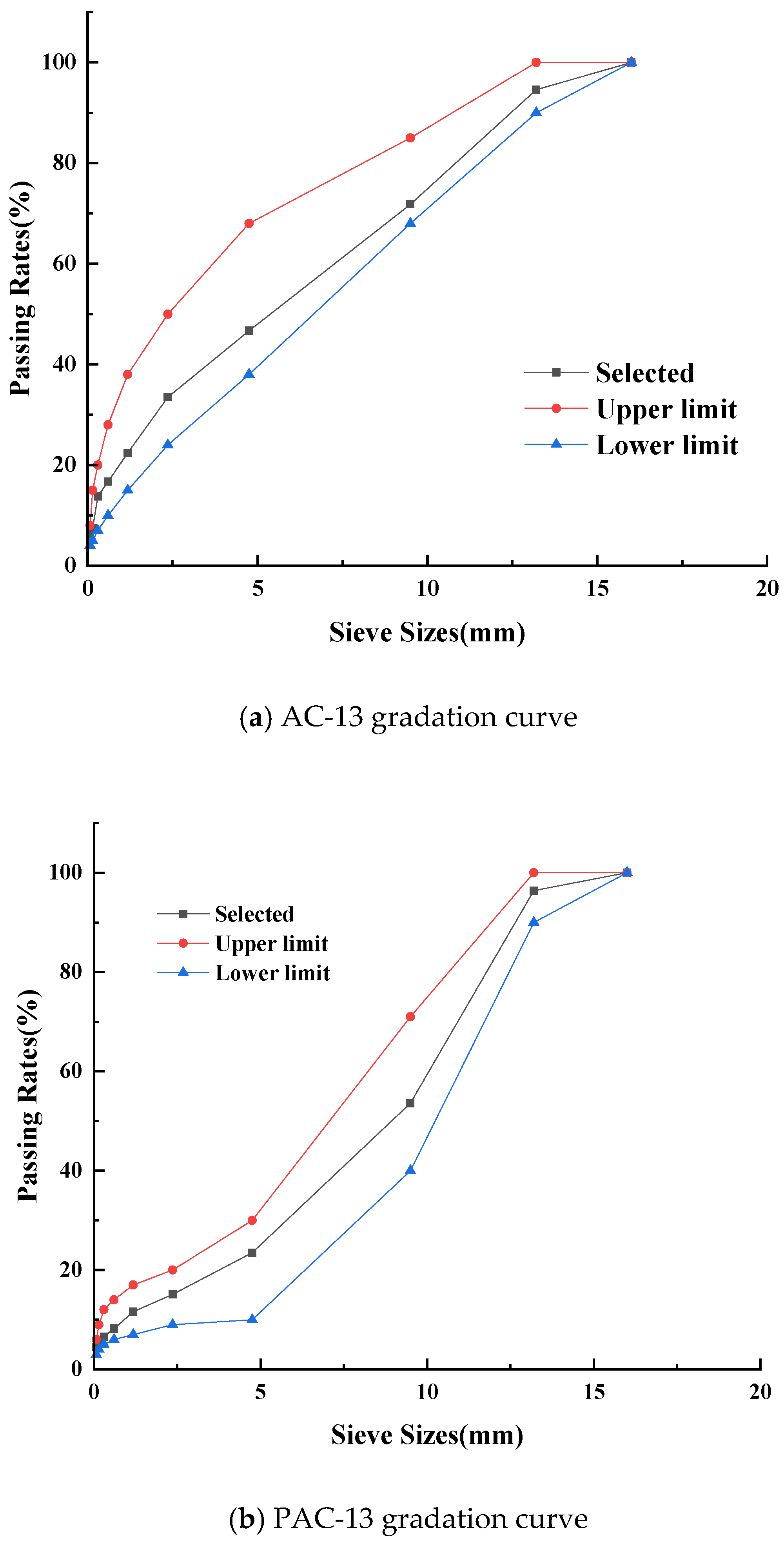 25], AC-13 and PAC-13 graded asphalt concretes were prepared, with their grading curve shown in