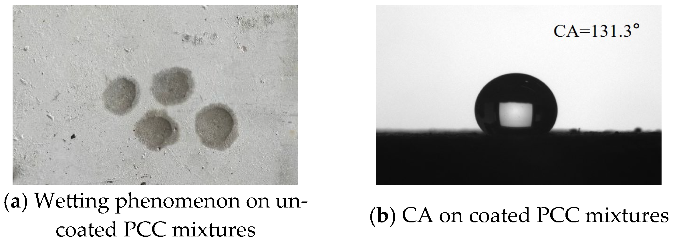 Application of the hydrophobic anti-icing coating results in the reduced of the mixtures. Therefore, the of mixtures was increased after coated, which results in the increased of of mixtures and the enhanced hydrophobic performance of mixtures after coated. Furthermore, comparing with asphalt mixtures, PCC mixtures with the rougher microscopic surface led to a higher roughness ratio and greater CA. Thus, PCC mixtures exhibited better hydrophobic properties.