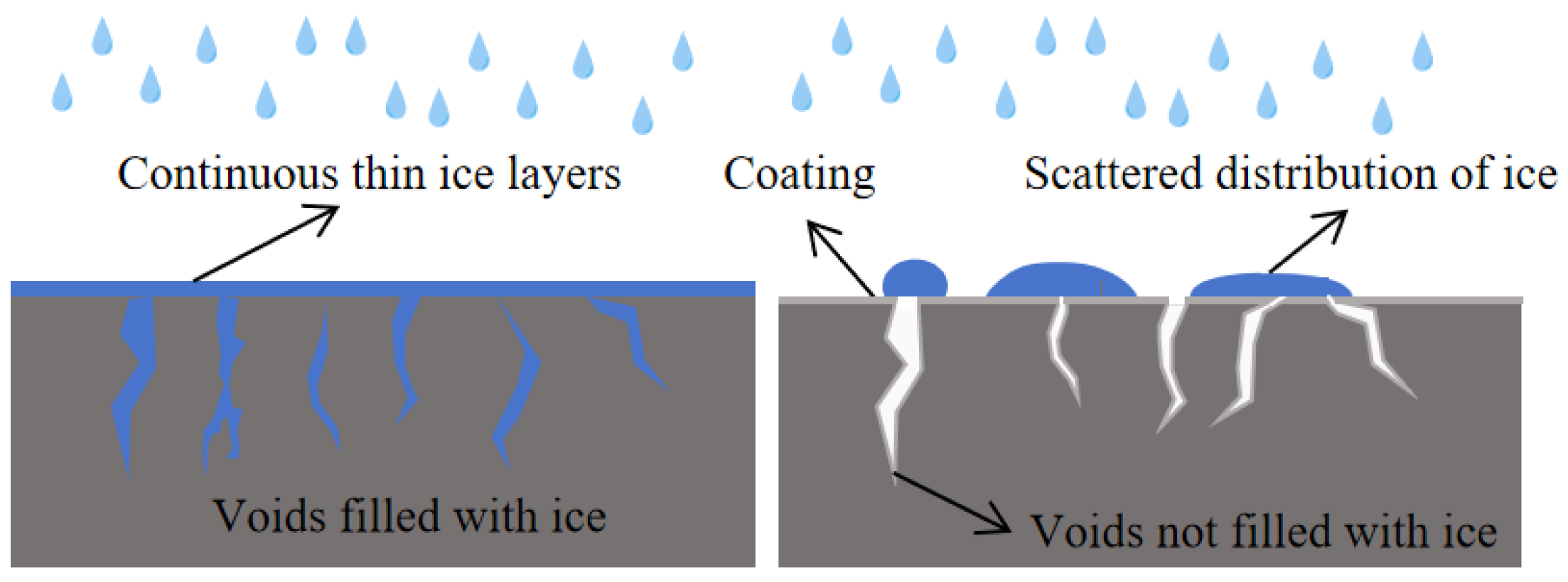 Figure 10c shows that water easily flows on the surface of the uncoated substrate, seeps into the slab, and eventually forms a large area of thin ice. In contrast, water on the coated substrate surface in