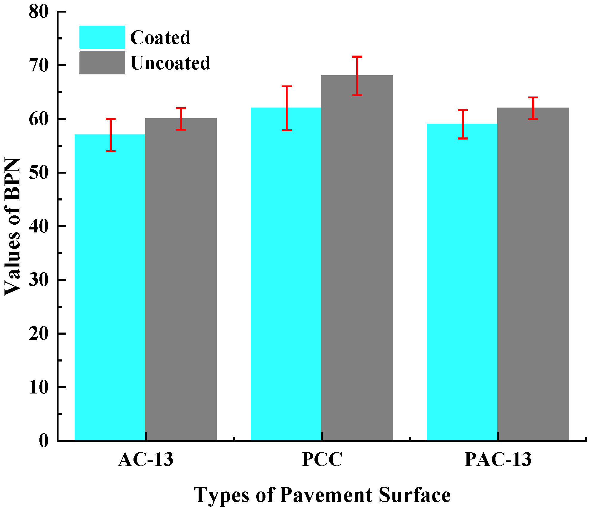 Figure 9). It exerted minimal influence on the surface texture and structural characteristics of the pavement. Therefore, after spraying coating materials on pavement, the anti-skid performance of the pavement will not be significantly reduction.