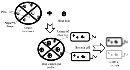 - Jiraroj, D.; Tungasmita, S.; Tungasmita, D.N. Silver ions and silver nanoparticles in zeolite A composites for antibacterial activity. Powder Technol. 2014, 264, 418–422. [Google Scholar] [CrossRef]