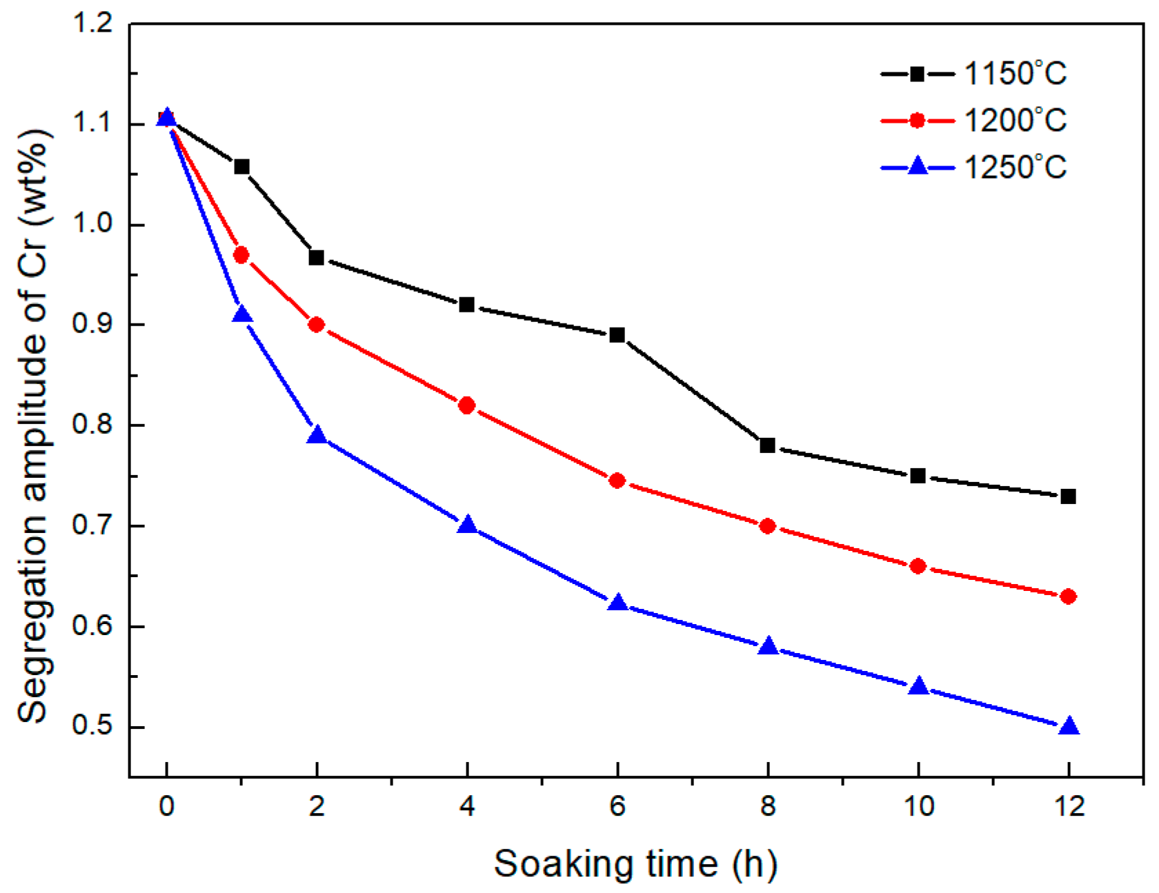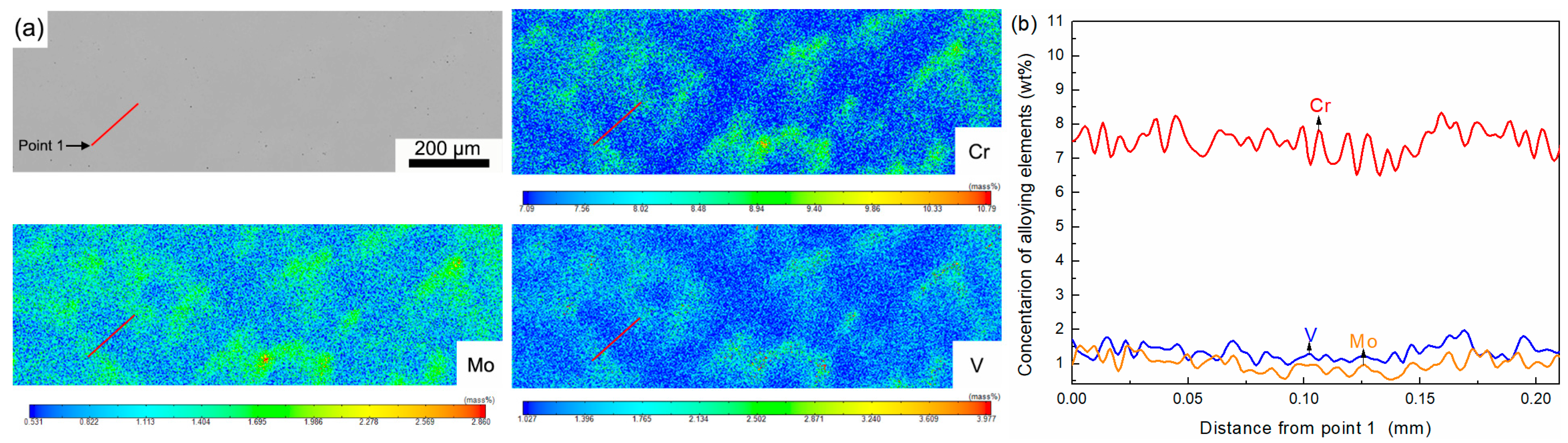 - He, S.; Li, C.; Ren, J.; Han, Y. Investigation on Alloying Element Distribution in Cr8Mo2SiV Cold-Work Die Steel Ingot during Homogenization. Steel Res. Int. 2018, 89, 1800148. [Google Scholar] [CrossRef]