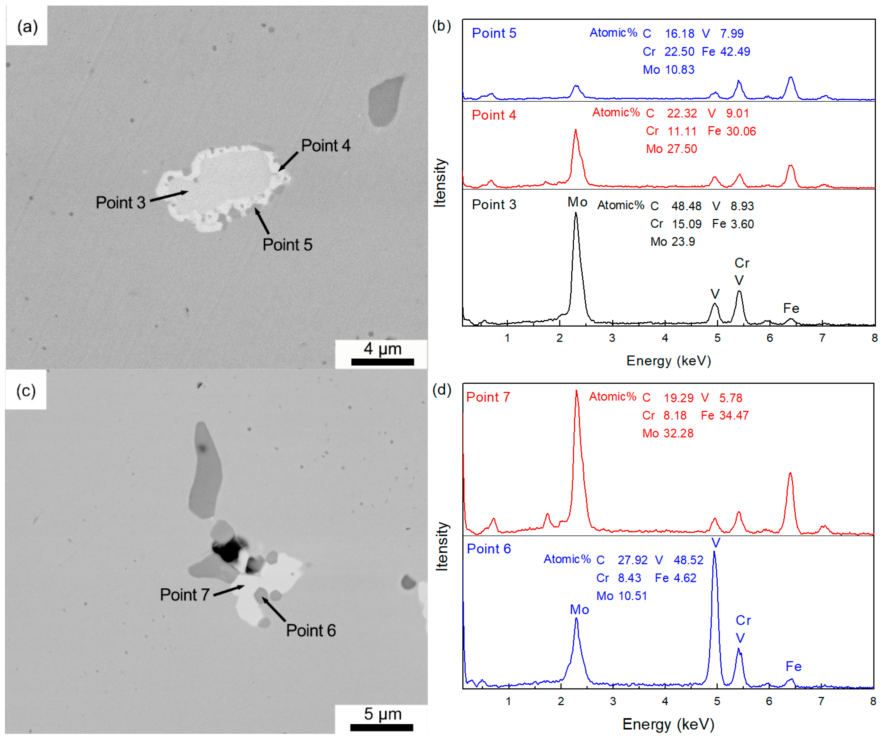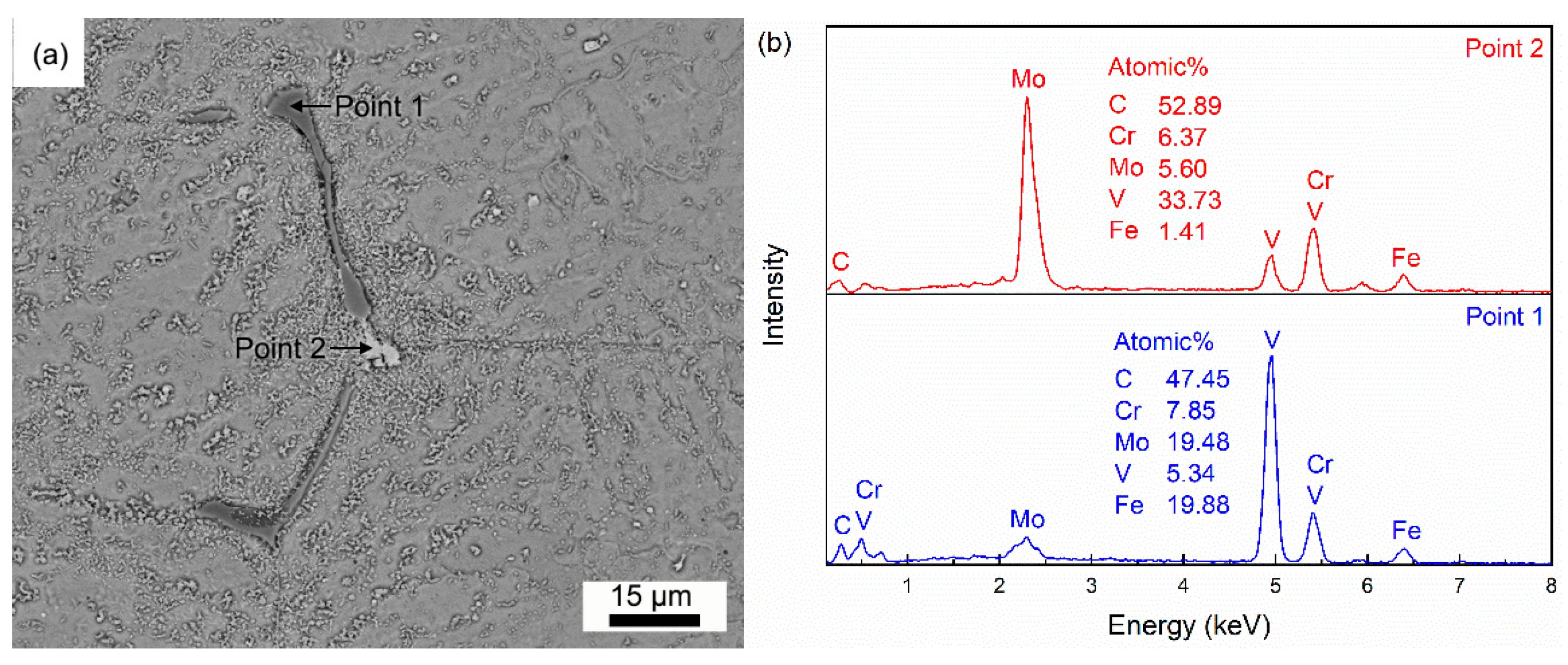 - Liu, W.; Guo, Y.; Cao, Y.; Wang, J.; Hou, Z.; Sun, M.; Xu, B.; Li, D. Transformation behavior of primary MC and M2C carbides in Cr4Mo4V steel. J. Alloys Compd. 2021, 889, 161755. [Google Scholar] [CrossRef]