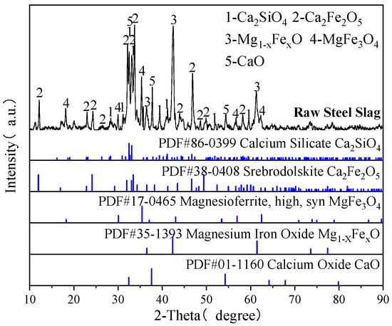 The steel slag used in the experiment was obtained from Zhanjiang, China. After undergoing 2 h of grinding in a ball mill, the steel slag was sieved into samples with different particle sizes for the carbonation experiment. High-purity N2 (99.99%, Beijing Jingcheng Gas Co., Ltd., Beijing, China) was used in the experiment. High-purity CO2 (99.95%, Beijing Jingcheng Gas Co., Ltd., Beijing, China) was used in the experiment, while simulated flue gas was prepared by mixing N2 and CO2 at controlled ratios. The chemical and phase compositions of steel slag determined by X-ray fluorescence (XRF) and X-ray diffraction (XRD) are shown in Table 1 and Figure 1, respectively. According to GB/T 38216.3-2023 [26], the content of f-CaO in steel slag was determined to be 7.34%.