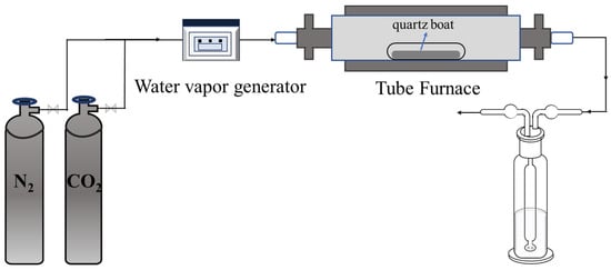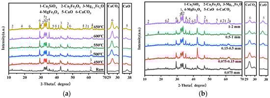The raw steel slag was crushed, ground, and sieved into five different particle size ranges: <75 μm, 75~150 μm, 150~500 μm, 500~1000 μm, and 1000~2000 μm. Approximately 1 g of each steel slag sample was placed in a quartz boat and introduced into a tube furnace for carbonation. During the experiment, N2 was used as a protective gas. The tube furnace was heated at a rate of 10 °C/min to the target carbonation temperature, which was typically 450 °C, 500 °C, 550 °C, 600 °C, or 650 °C. In the actual steelmaking process, these temperatures can be achieved during the cooling of hot slag without additional heat supplement. Once the target temperature was reached, the CO2 flow rate (30–70 mL/min), CO2 concentration (20%, 40%, 60%), and steam content (5%, 10%, 15%, 20%) were adjusted as required. The carbonation reaction was then maintained at the set temperature for 2 h.