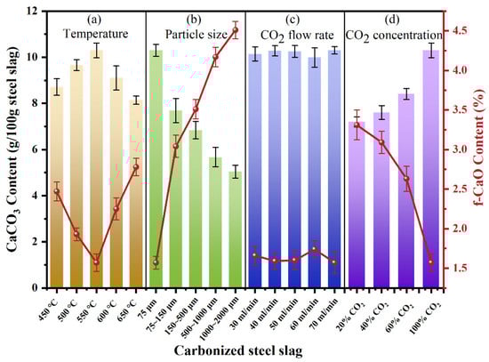 CaCO3 and f-CaO content after carbonation of steel slag: (a) Temperature, (b) particle size, (c) CO2 flow rate, and (d) CO2 concentration.