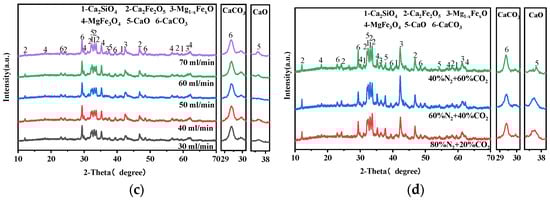 Figure 4 presents the XRD patterns of carbonated steel slag under various carbonization conditions. All carbonated steel slag samples exhibit a typical calcite diffraction peak at 2θ = 29.40°, while the intensity of f-CaO peaks decreases significantly after carbonation. Changes in carbonation temperature and particle size of steel slag cause obvious variations in phase compositions, whereas the CO2 flow rate produces negligible changes in CaCO3 and CaO peak intensities, which is consistent with CaCO3 production in Figure 3. When the CO2 concentration is 20% (Figure 4d), the characteristic peak intensity of CaCO3 in the carbonized steel slag still remains distinct. In addition, the peak intensity of dicalcium–silicate- and iron-containing minerals in carbonated steel slag samples remain essentially unchanged, indicating that only f-CaO is involved in the gas–solid carbonation reaction.