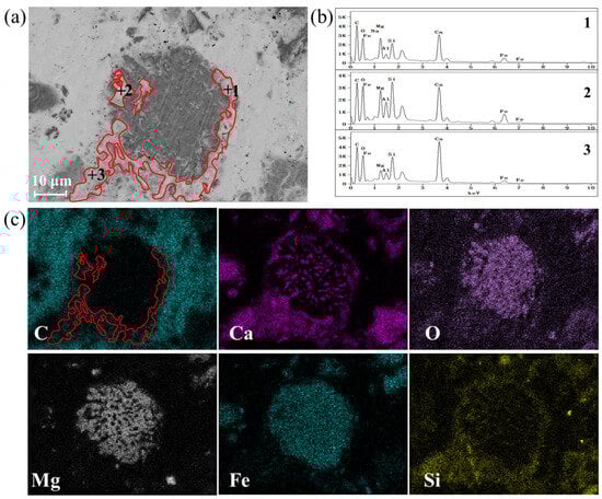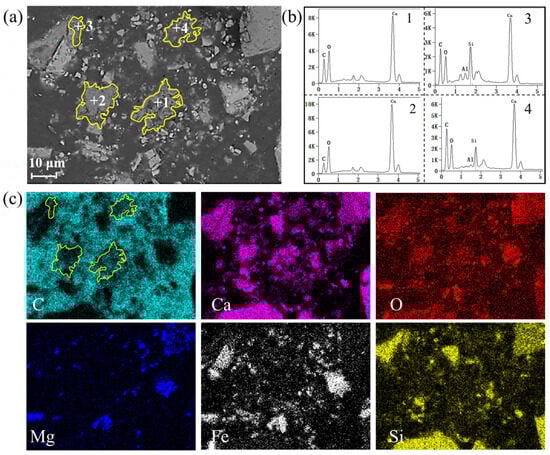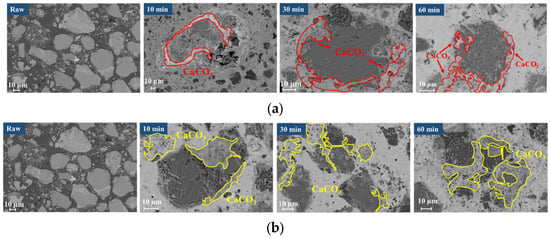 In contrast, under the steam/CO2 mixed atmosphere (Figure 12b), combined with the analysis in Figure 9, the f-CaO in the steel slag reacts with steam to generate Ca(OH)2, accompanied by a significant volume-expansion effect, leading to the effective crushing of steel slag particles into smaller sizes, as clearly observed in Figure 12b. Compared with the particles in Figure 12a, those in Figure 12b exhibit a significantly reduced size. The crushing of steel slag particles exposes the f-CaO within the steel slag, which greatly improves further contact between f-CaO and CO2, and then promotes the generation of CaCO3, resulting in a denser distribution of CaCO3 in the mixed atmosphere of steam/CO2. These microstructural changes align well with the experimental results of CaCO3 content in the presence of steam (Figure 6) and the BET results (Figure 7), providing intuitive evidence for the positive role of steam in promoting carbonation of steel slag.