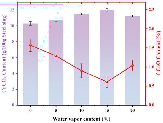 Figure 6 shows the amount of CaCO3 produced by carbonated steel slag with different steam contents. The content of carbonized CaCO3 initially increases and then decreases with rising steam content. The amount of CaCO3 reaches 12.02 g/100 g steel slag upon the injection of 15% steam, which is an increase of 16.70% when compared to its content under pure CO2. Correspondingly, the residual f-CaO content decreases sharply by 0.61%, indicating that 91.73% of the initial f-CaO has been mineralized. Compared with the mineralization process without steam injection, the mineralization efficiency of f-CaO has increased by 20.24%, suggesting that the injection of steam promoted the almost complete reaction of f-CaO. However, excessive steam inhibits carbonation because thick water films form on particle surfaces, which prevents CO2 entry and restricts the reaction to the outer surface layer [30]. Table 2 lists the performance comparison between the results of this study and others, in reference to the strengthening effects of steam in the direct carbonization of steel slag. In this study, the carbonation efficiency and the residual amount of f-CaO in steel slag are better than those reported in the references.