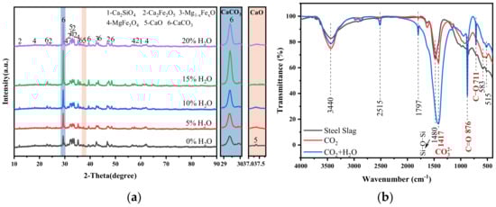 Effect of steam on X-ray diffraction (XRD) and Fourier transformation infrared spectroscopy (FTIR) of carbonated steel slag. (a) XRD diagram of carbonated steel slag with different steam content; (b) FTIR analysis of steel slag before and after carbonation.
