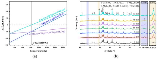 The above experiments demonstrate that steam has a positive effect on the carbonation process of steel slag. Based on the thermodynamic principle, the influence of steam on the carbonation of steel slag was analyzed in the standard state. Figure 9a shows the change in Gibbs free energy of reactants under the condition of a steam/CO2 atmosphere. As illustrated in Figure 9a and summarized in Table 3, Equations (3)–(5) can proceed spontaneously within the temperature range of 273 to 814 K, under standard conditions. At 550 °C (823 K), the reactivities of Equations (3) and (5) are comparable and both more favorable than that of Equation (4). Therefore, when the reactive gas contacts the steel slag, CO2 preferentially reacts with f-CaO exposed on the surface of steel slag (Equation (3)). At the same time, steam permeates the porous slag structure and reacts with f-CaO to generate Ca(OH)2 (reaction 4). The formation of Ca(OH)2 involves a volume expansion of about 98% [40], which pulverizes the steel slag and exposes the f-CaO inside the steel slag. The newly exposed f-CaO subsequently reacts with CO2, while Ca(OH)2 is further carbonated according to reaction (5). Therefore, the presence of steam enables a more complete conversion of f-CaO in steel slag.