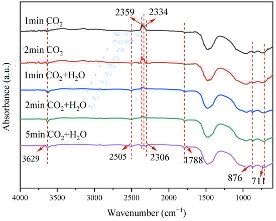 The above experimental results strongly support the positive promotion of steam on the carbonation process of steel slag. The carbonation of steel slag is obviously accelerated by the formation of the intermediate of Ca(OH)2. To further confirm the role of steam, this dynamic process was clearly conducted by in situ FTIR. Figure 10 shows the in situ FTIR spectra of steel slag in CO2 and CO2 + H2O atmospheres at 550 °C. The doublets at 2359 and 2334 cm−1 correspond to the ν3 asymmetric stretching vibration of gaseous CO2 split by Fermi resonance. A new band at 2306 cm−1, appearing only in the CO2 + H2O atmosphere, can be attributed to linearly adsorbed CO2 species on basic sites, implying that steam enhances CO2 chemisorption, possibly via surface HCO3−. The bands at 1788, 876, and 711 cm−1 are assigned to the ν2 bending, ν4 in-plane bending, and ν2 lattice modes of CO32−, respectively, indicating the presence of calcitic CaCO3. Their integrated intensities increase monotonically over time and are significantly larger in the presence of steam, confirming that H2O accelerates CaCO3 formation. These observations support the sequential pathway CaO → Ca(OH)2 → CaCO3, which proceeds faster than direct gas–solid carbonation. The 3629 cm−1 peak, assigned to surface -OH groups and possibly including transient Ca(OH)2 stabilized on the slag matrix, intensifies within the first minute under CO2 + H2O, indicating rapid water adsorption and hydroxylation of the slag surface.