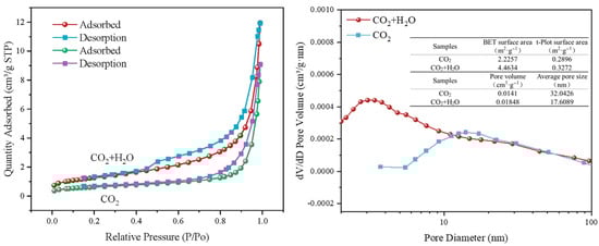 Figure 11 presents the N2 adsorption–desorption isotherms and pore structure parameters of steel slag carbonated at 550 °C for 2 h under CO2 and CO2 + H2O atmospheres. Compared to conditions under pure CO2, steam introduction increases the BET surface area from 2.23 m2·g−1 to 4.46 m2·g−1, indicating enhanced activation of Ca/Mg bearing phases and the creation of micro- and mesopores. The mean pore size decreases from 32 nm to 17 nm, while the pore volume increases by 31% to 0.0185 cm3·g−1. The transition from “fewer, larger” to “numerous, medium sized” pores facilitates CO2 diffusion.