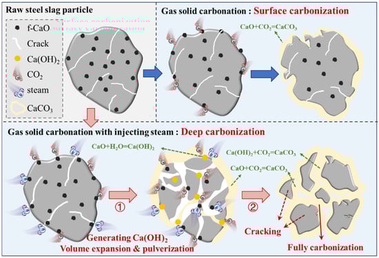 - The mechanism of direct mineralization of steel slag enhanced by steam was expounded. Steam enters the open pores of the slag and reacts with f-CaO to generate Ca(OH)2, leading to volume expansion and consequently causing physical crushing and refinement of steel slag particles. The volume expansion and pulverization caused the f-CaO to be exposed to the surface, facilitating an increased contact between the f-CaO and CO2. Meanwhile, the newly generated Ca(OH)2 further reacts with CO2 to produce CaCO3, thereby accelerating the entire carbonation reaction.