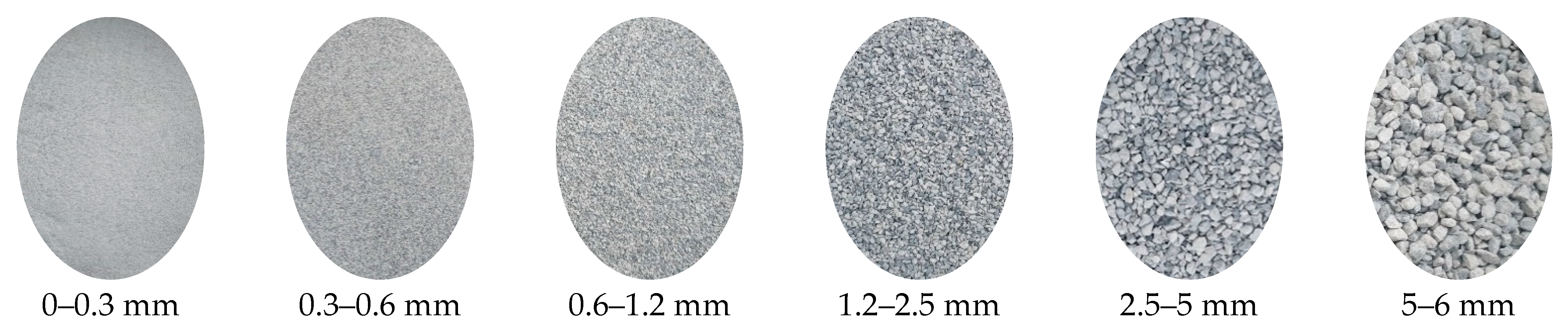 - Pan, Y.; Yuan, H.; Zhai, S.; Geng, Z.; Huo, F. Study on Slump and Compressive Strength of Gangue Based on Aggregate Size Gradation. Appl. Sci. 2024, 14, 4214. [Google Scholar] [CrossRef]