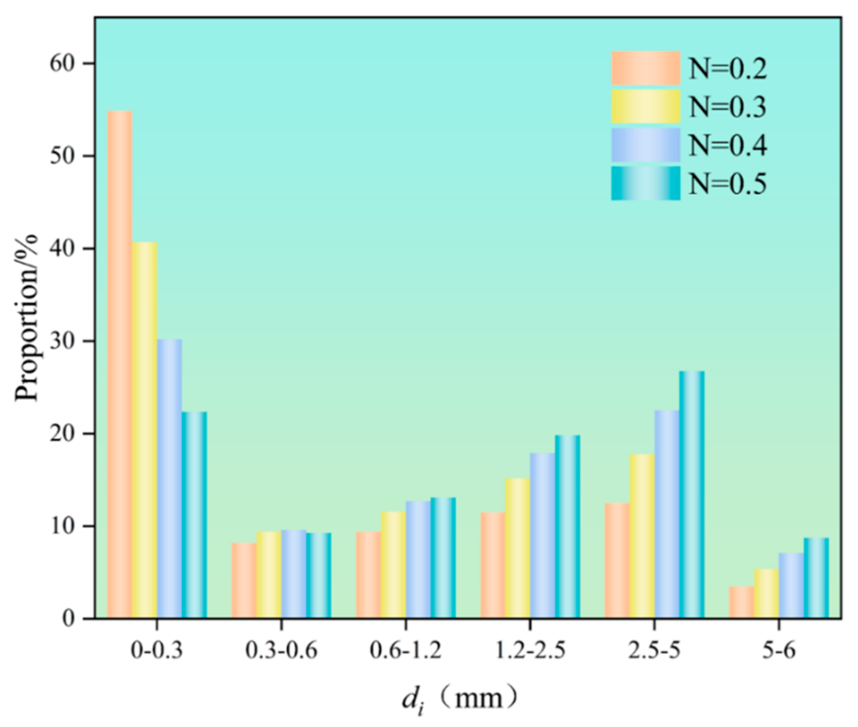 - The optimal mixture proportion for PGS is established at gradation n = 0.4 combined with W/S 0.18, where balanced coarse-to-fine particle distribution enables thorough occupation of the coarse-particle skeletal framework by fines, achieving minimal porosity while comprehensively satisfying all pumping specifications. This study provides an important experimental basis for the selection of crushing parameters and mixture proportioning in subsequent industrial-scale mine backfill systems.