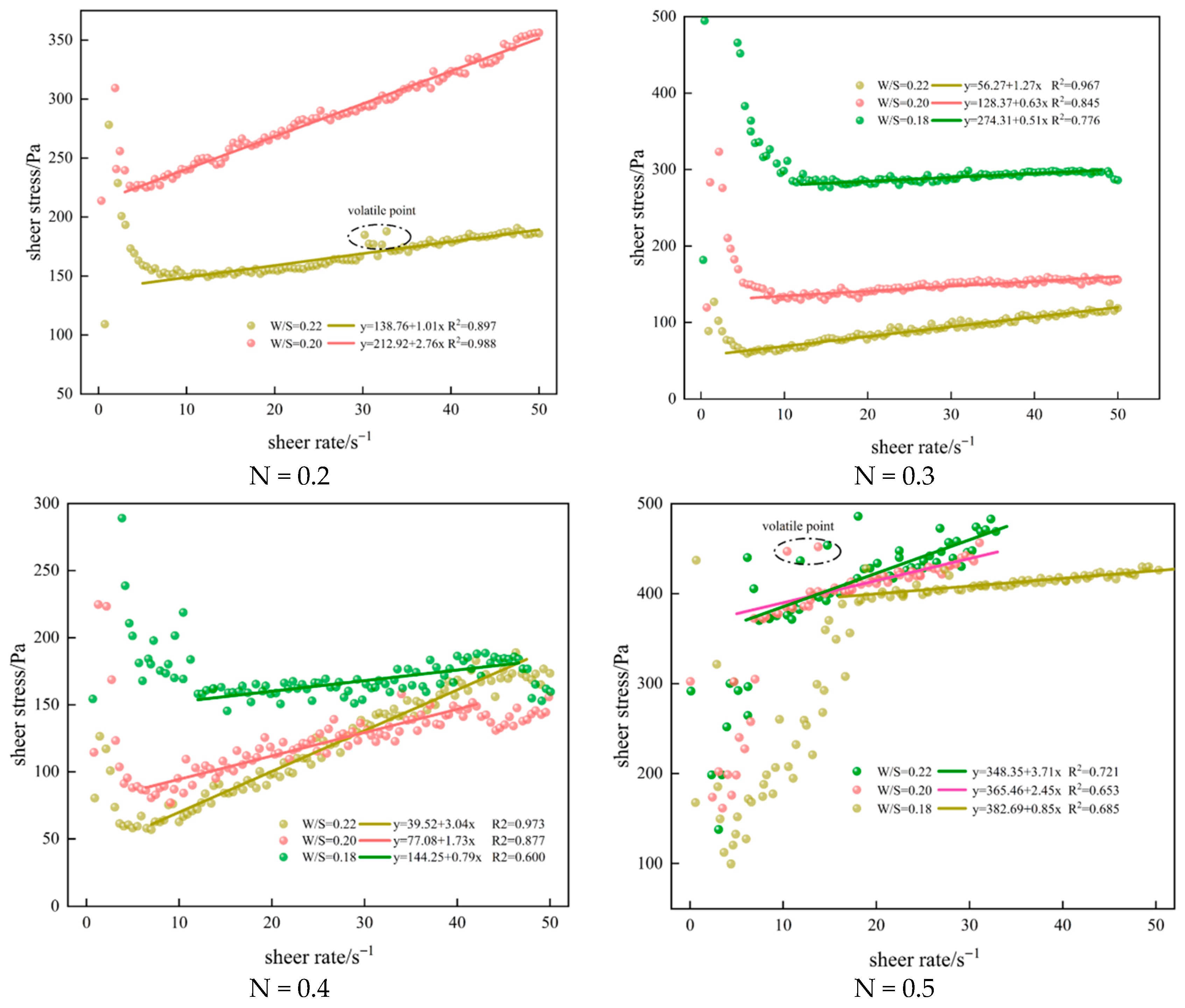 - In this study, the shear stress of the PGS increases with the shear rate, demonstrating good agreement with the Bingham rheological model. As W/S decreases, heightened slurry concentration intensifies particle flocculation while reducing free water availability, diminishing lubrication; consequently, yield stress rises and fluidity declines, though stability improves. Lower gradation indices with abundant fine particles necessitate excessive water, rendering them unsuitable for high-concentration backfill applications.