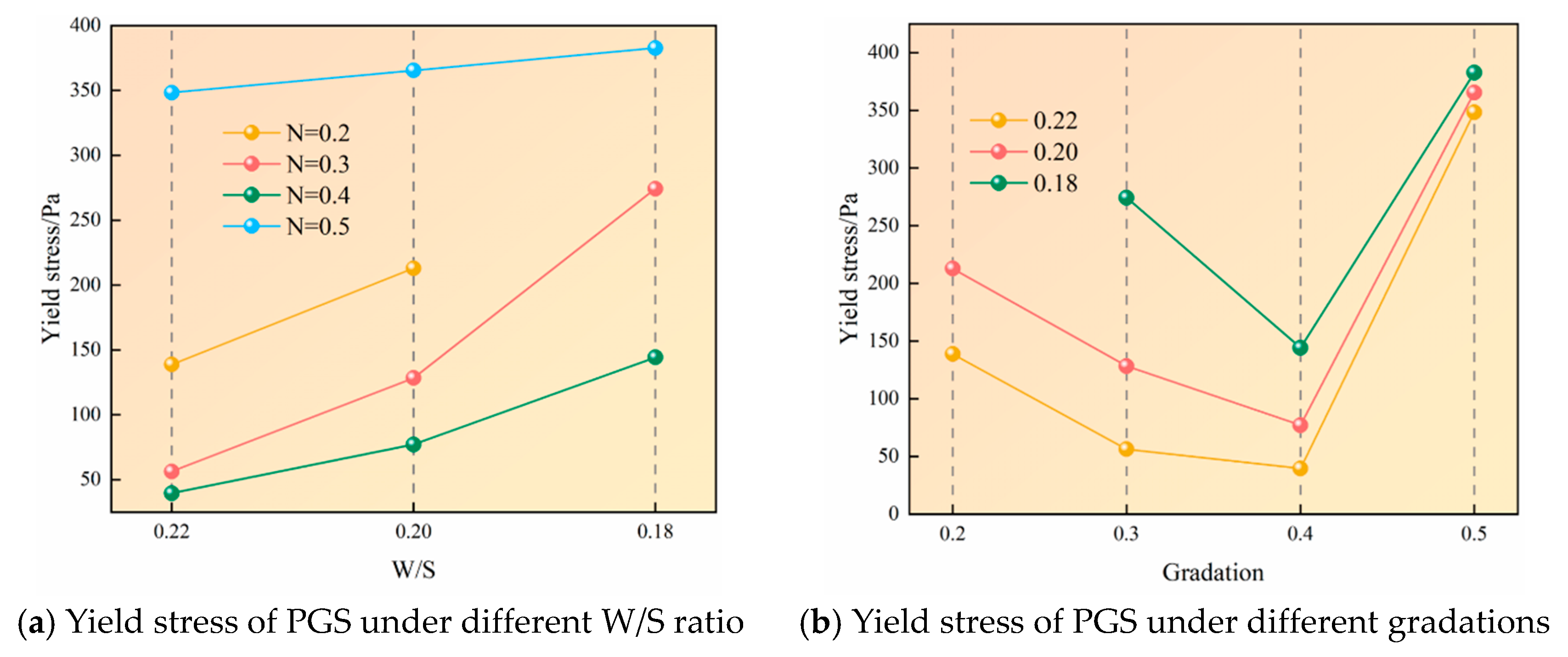 3.2. The Influence of Rheological Properties Under Different Gradation and W/S