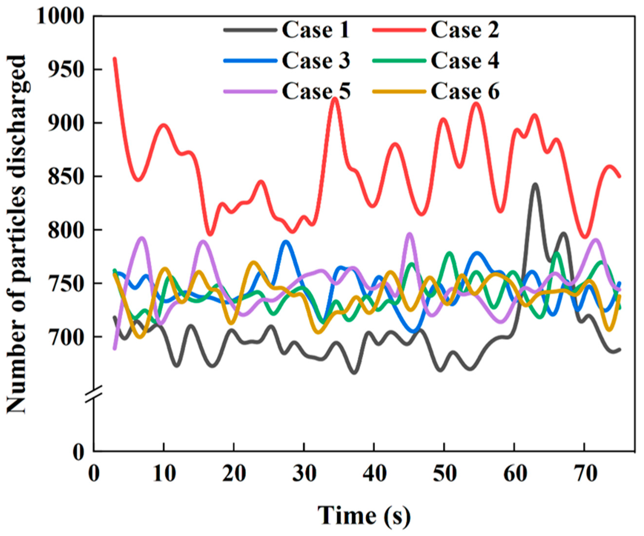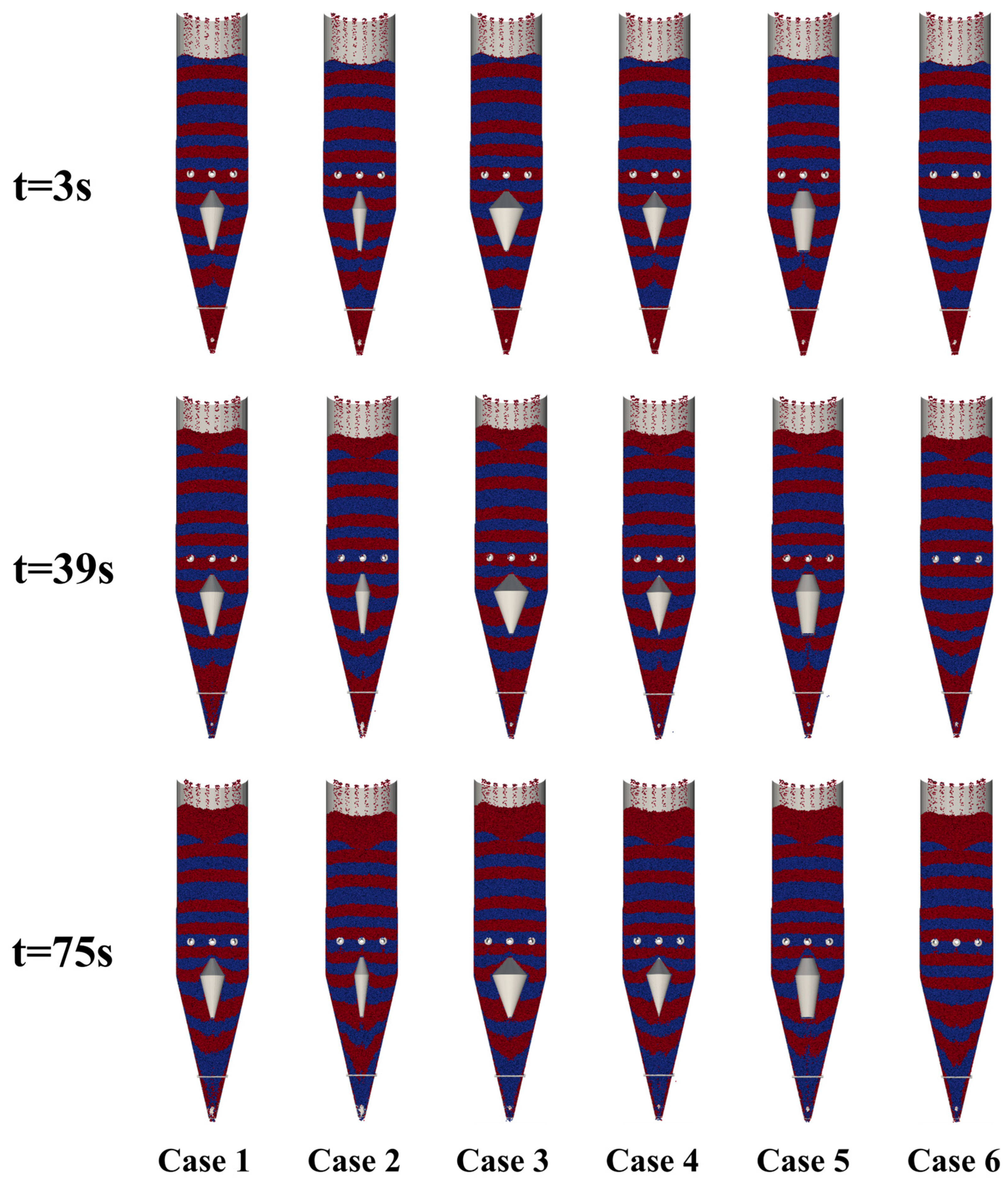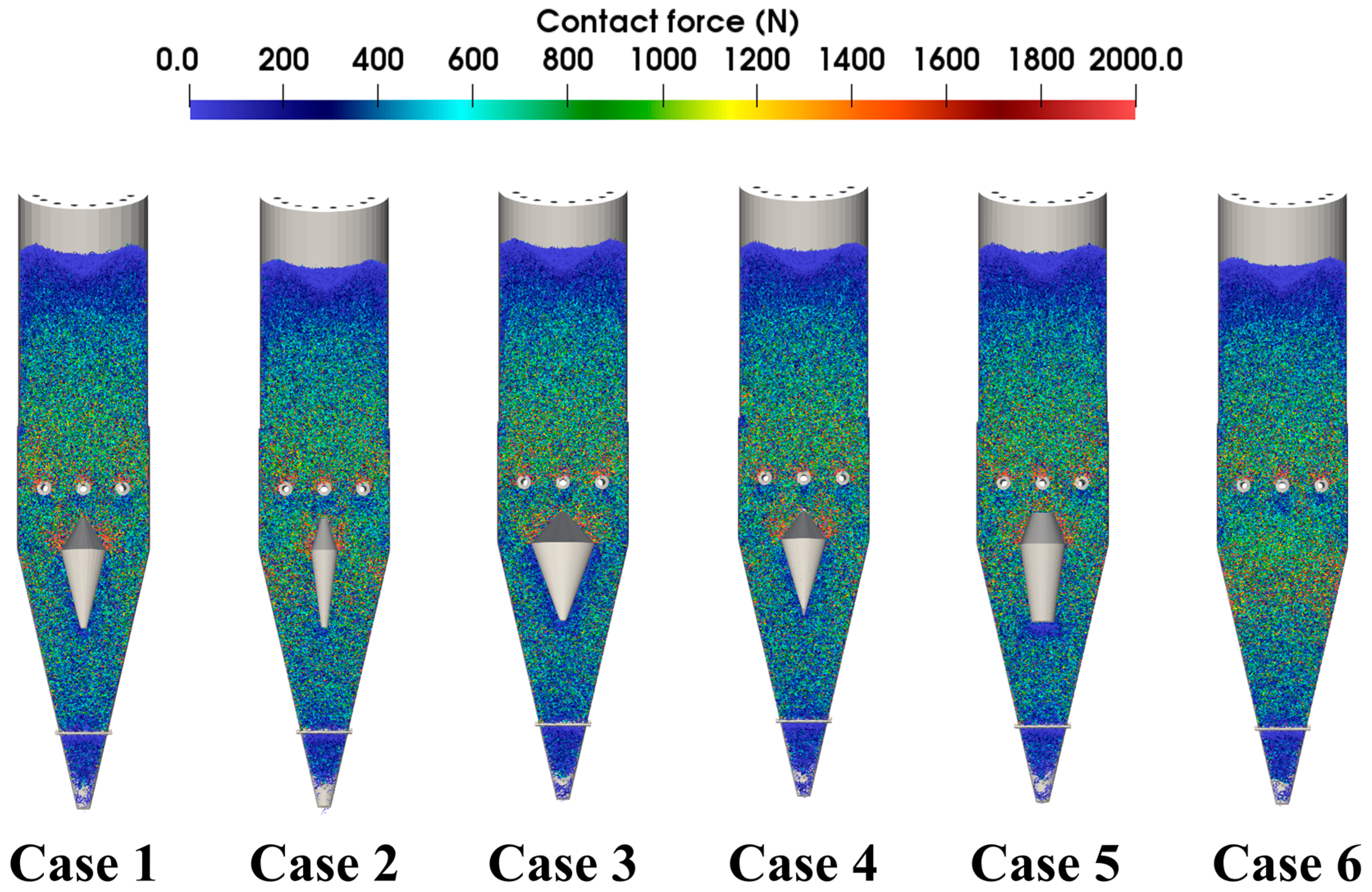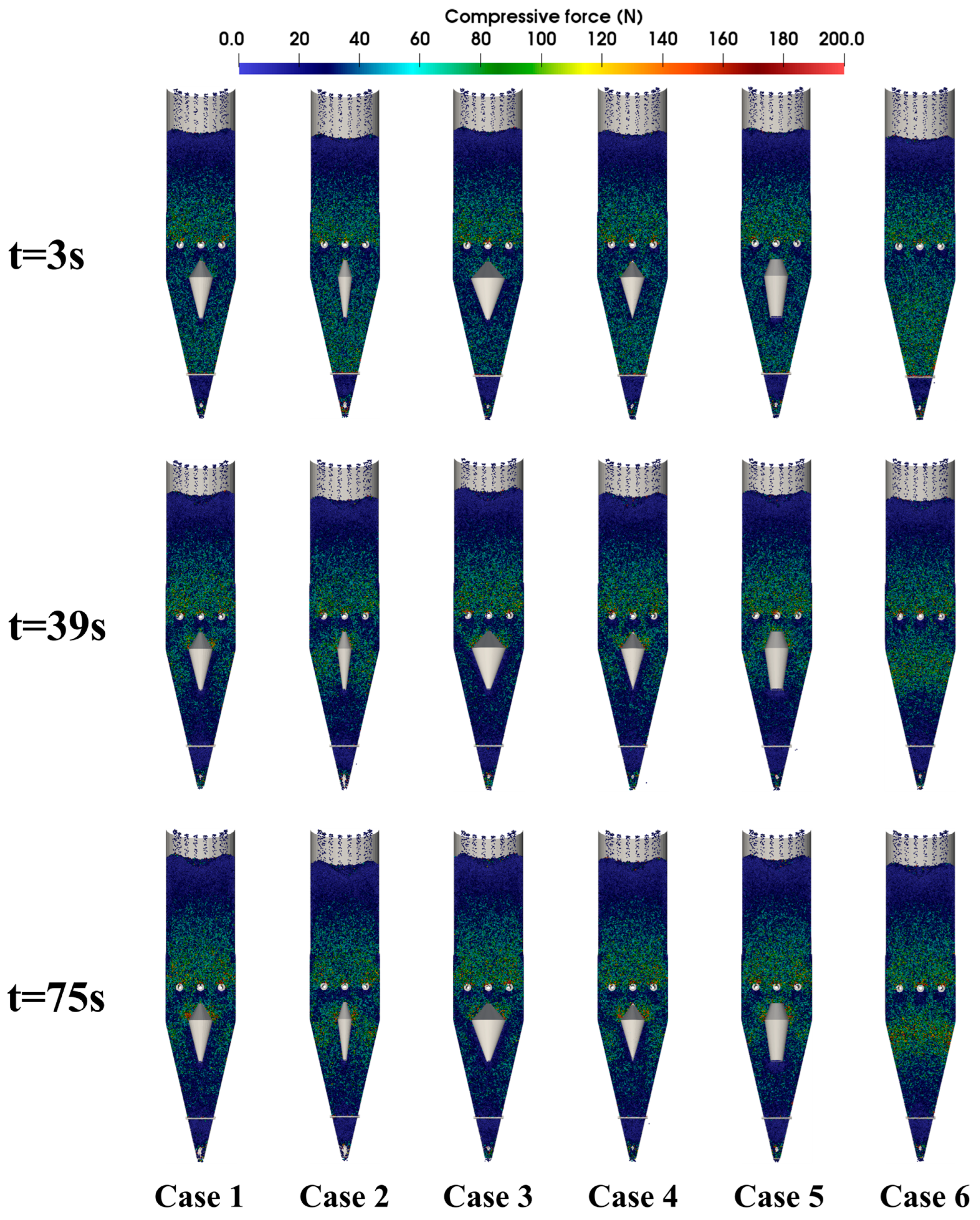 - In particular, Case 2, with a smaller central diameter, produced the most favorable dynamics, resulting in faster particle discharge and a more uniform descent compared to other cases. However, this configuration also exhibited relatively higher energy dissipation, implying a potential risk of pellet fragmentation. In contrast, larger distributor diameters (e.g., Case 3) reduced compressive force concentration and lowered average energy dissipation (8.28 J/kg), but with slightly reduced discharge efficiency. These findings highlight the trade-off between flow uniformity and particle integrity.