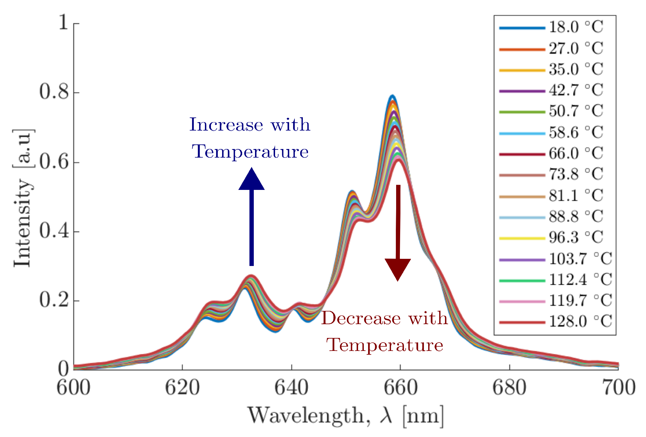 - SiR 2 (nm peak): Coupled with a nm bandpass filter (Thorlabs Inc., Newton, NJ, USA) to isolate region 2, which decreases inversely proportional to increased temperature. The nm bandpass filter was chosen to reject the influence of the spectral broadening; this was observed when using bandpass filters close to a nm peak, causing an increase in the total signal intensity in that region, as opposed to the expected decrease.