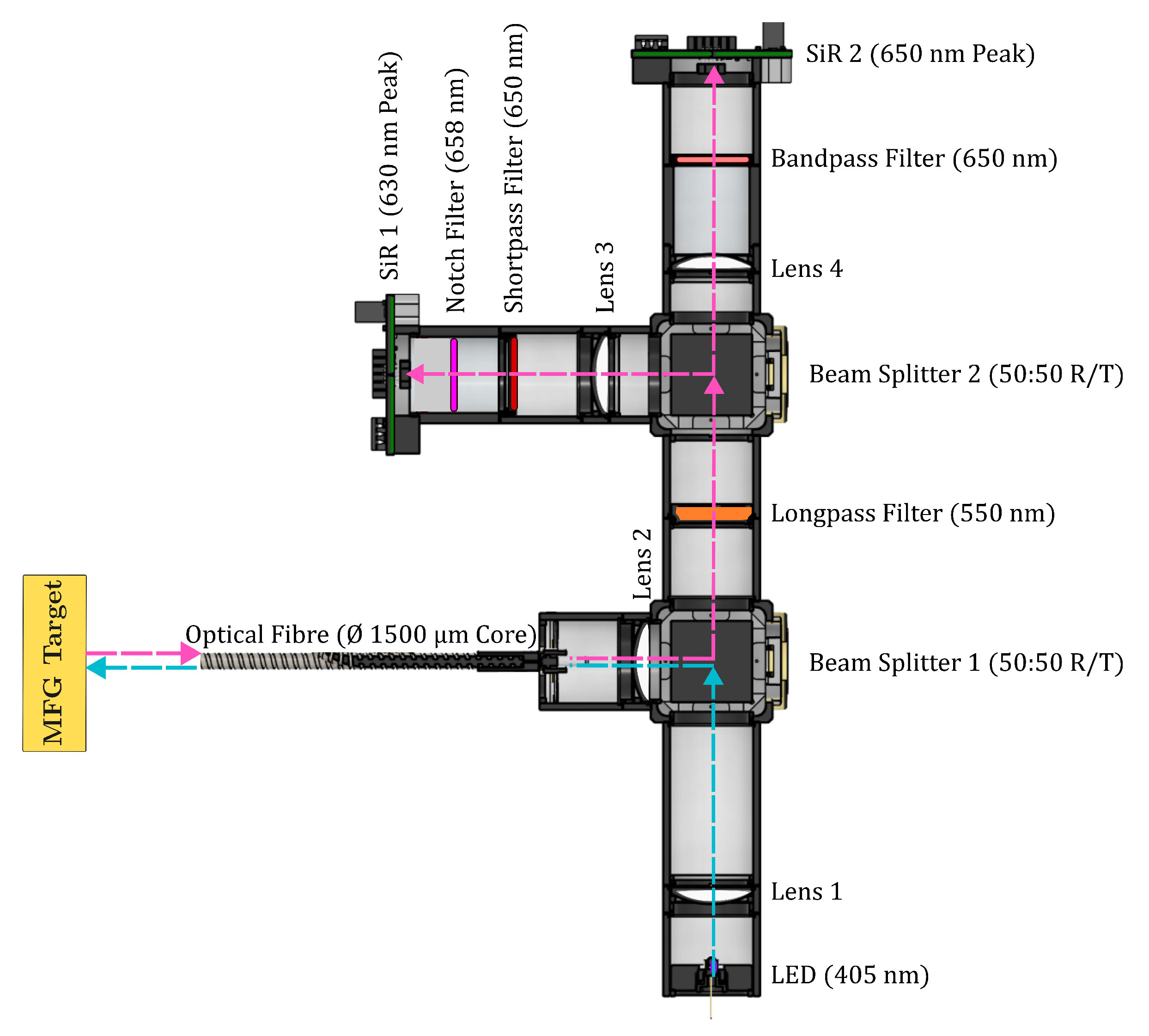 - SiR 1 (nm peak): Coupled with a nm shortpass filter (Thorlabs Inc., Newton, NJ, USA) and nm notch filter (Thorlabs Inc., Newton, NJ, USA) to isolate region 1, with a peak intensity at nm, which increases proportionally to increased temperature. The nm filter was used to select the correct region, while the nm notch filter provided a sharp rejection of the neighbouring emissions.