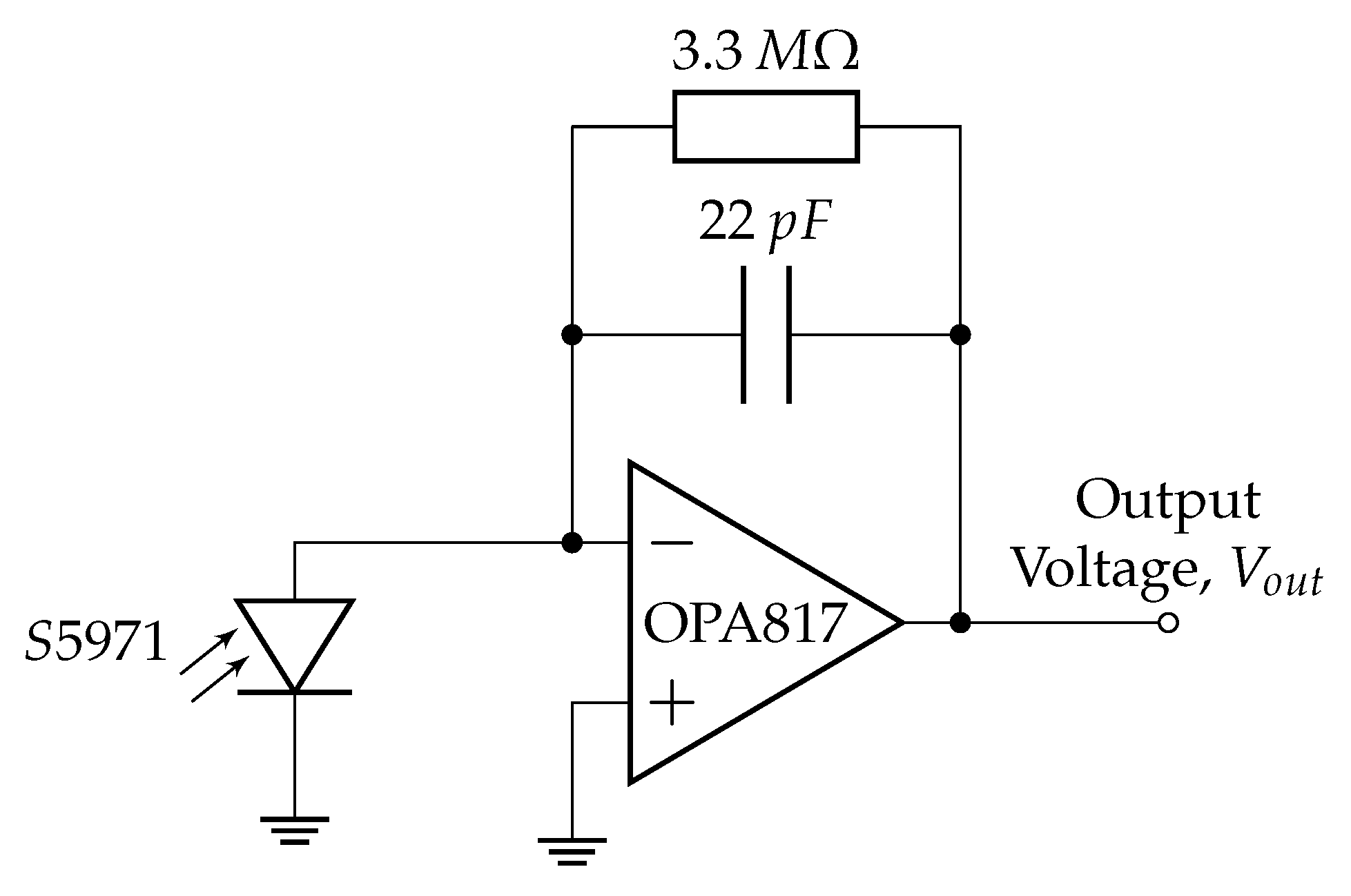 - Hamamatsu. Si Photodiode: S5971. Available online: https://www.hamamatsu.com/eu/en/product/optical-sensors/photodiodes/si-photodiodes/S5971.html (accessed on 11 October 2023).