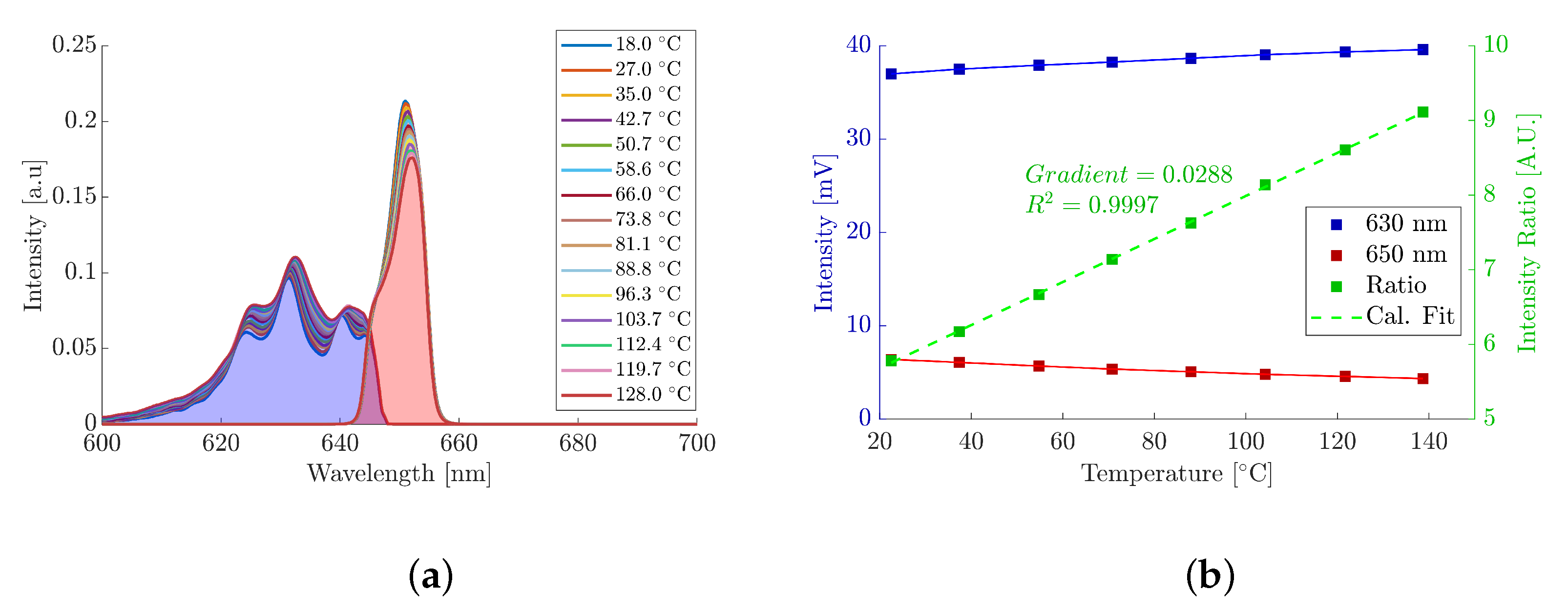 - Sutton, G.; Greenen, A.; Roebuck, B.; MacHin, G. Imaging phosphor thermometry from T = 20 °C to 450 °C using the time-domain intensity ratio technique. Meas. Sci. Technol. 2019, 30, 044002. [Google Scholar] [CrossRef]