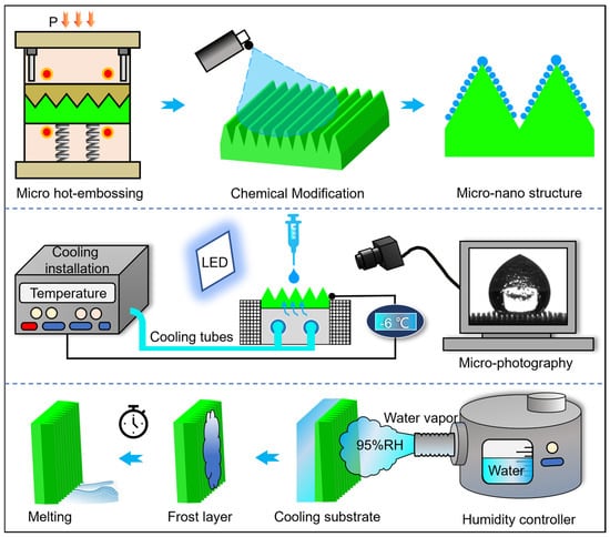 Hydrophobic surface microstructures have functional properties such as anti-icing [], drag reduction [], antibacterial [], and oil resistance [] and have shown great application potential in aerospace [], energy and power [], biomedicine [], marine vessels [], and efficient thermal management []. However, when aircraft fly through clouds, supercooled water droplets or water vapor may cause ice to form or even accumulate on the surface of the aircraft, which poses a great challenge to flight safety and operational efficiency. Therefore, developing a long-term, highly effective aircraft anti-icing technology is of great importance.