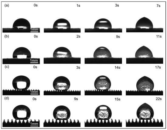 Freezing behavior of droplets on microstructures: (a) flat; (b) T = 100 μm; (c) T = 300 μm; (d) T = 500 μm.