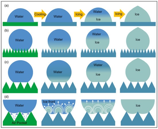 Schematic diagram of the droplet-freezing process: (a) flat; (b) smaller-scale microstructure; (c) larger-scale microstructure; (d) partial enlargement of (c), the blue dashed arrow indicates the suppression effect of air pockets on droplet wetting within the microstructure, while the white arrow indicates the direction of movement of the ice front during droplet freezing.