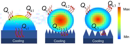 where represents the rate of heat change of the water droplet on the superhydrophobic surface per unit time, is the heat absorbed from the environment, and and correspond to the heat loss through the gas–liquid interface and solid–liquid interface, respectively.