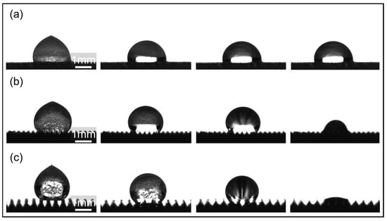 Melting process of droplets on microstructures: (a) T = 100 μm; (b) T = 300 μm; (c) T = 500 μm.