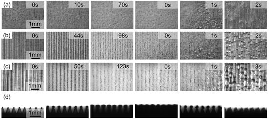 As shown in Figure 8a, compared with the surface without hydrophobic treatment, the freezing time of droplets was significantly prolonged after chemical modification: the flat microstructure was delayed from 7 s to 39 s, a delay of 420%; the T = 100 μm microstructure was delayed from 11 s to 60 s, a delay of 445.5%; the T = 300 μm microstructure was delayed from 17 s to 71 s, a delay of 317.6%; and the T = 500 μm microstructure was delayed from 22 s to 95 s, a delay of 331.8%. In addition, compared with the initial plane, the freezing time of droplets on the surface of the micro-nano composite structure was delayed by up to 1166.67%, demonstrating excellent anti-icing performance. The freezing behavior of droplets is also different from that of single-channel structures. When frozen, the droplet first undergoes a stable period, and instantly becomes opaque as a whole before starting to freeze. The ice front gradually moves upwards from the contact point between the microstructure and the droplet until it is completely frozen.