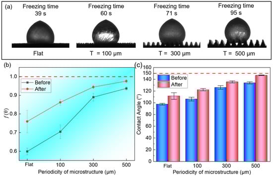 The change in the nucleation barrier of the microstructure after hydrophobic modification can be calculated, as shown in Figure 8b. Therefore, the f(θ) on the modified surface increases compared to the unmodified microstructure surface, which means an increase in the nucleation barrier. At this time, the droplet must be supercooled more deeply, which requires a longer contact time to overcome the higher energy barrier to initiate ice crystal nucleation and then advance the ice front to completely freeze the droplet.