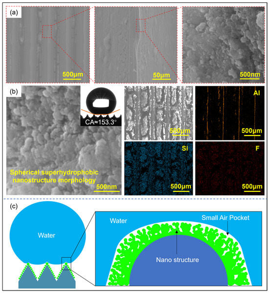 Surface morphology of T = 500 μm microchannel after chemical modification. (a) Micro-nanostructure; (b) contact angle and element distribution; (c) hydrophobic mechanism of the multi-level hierarchical structure.