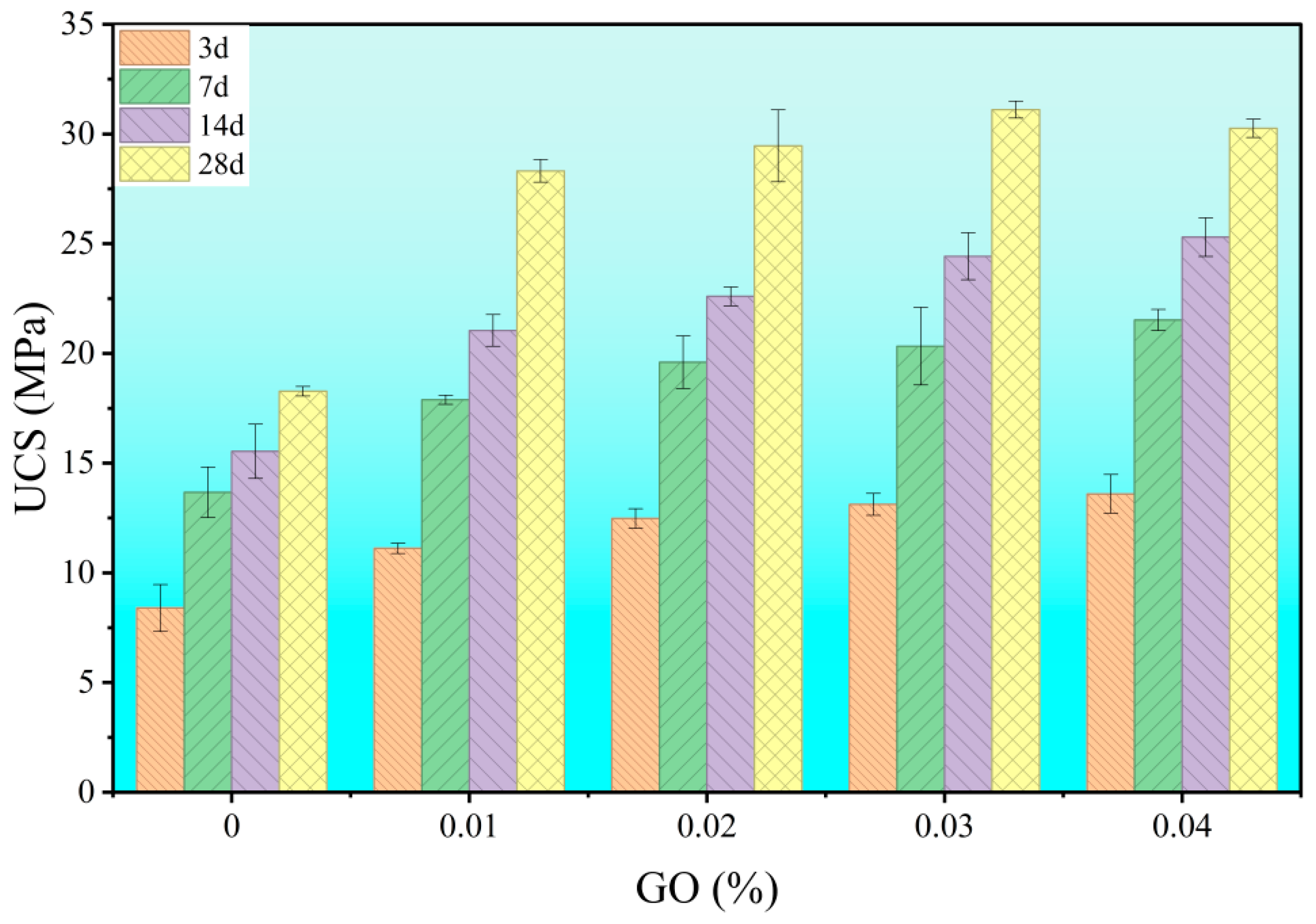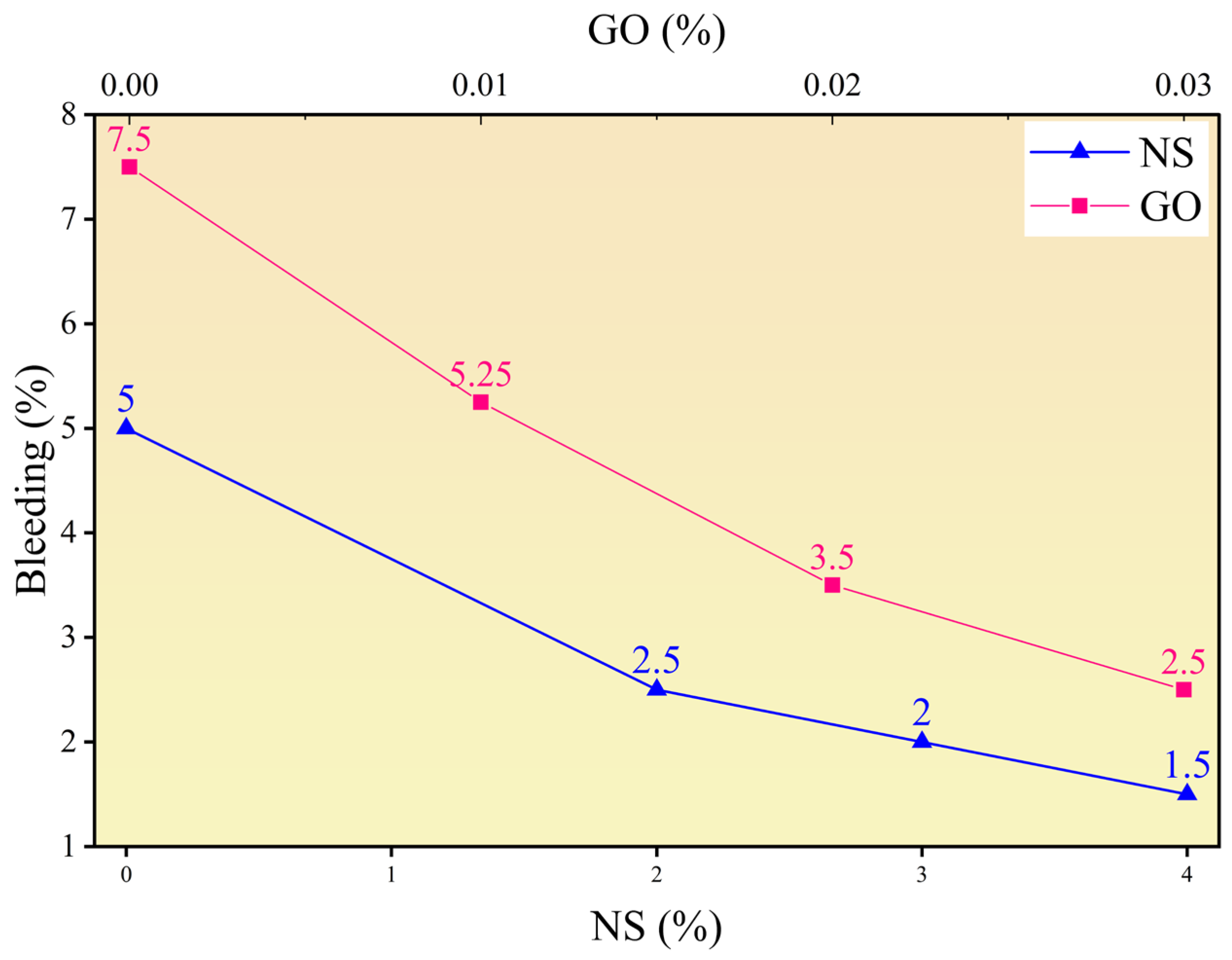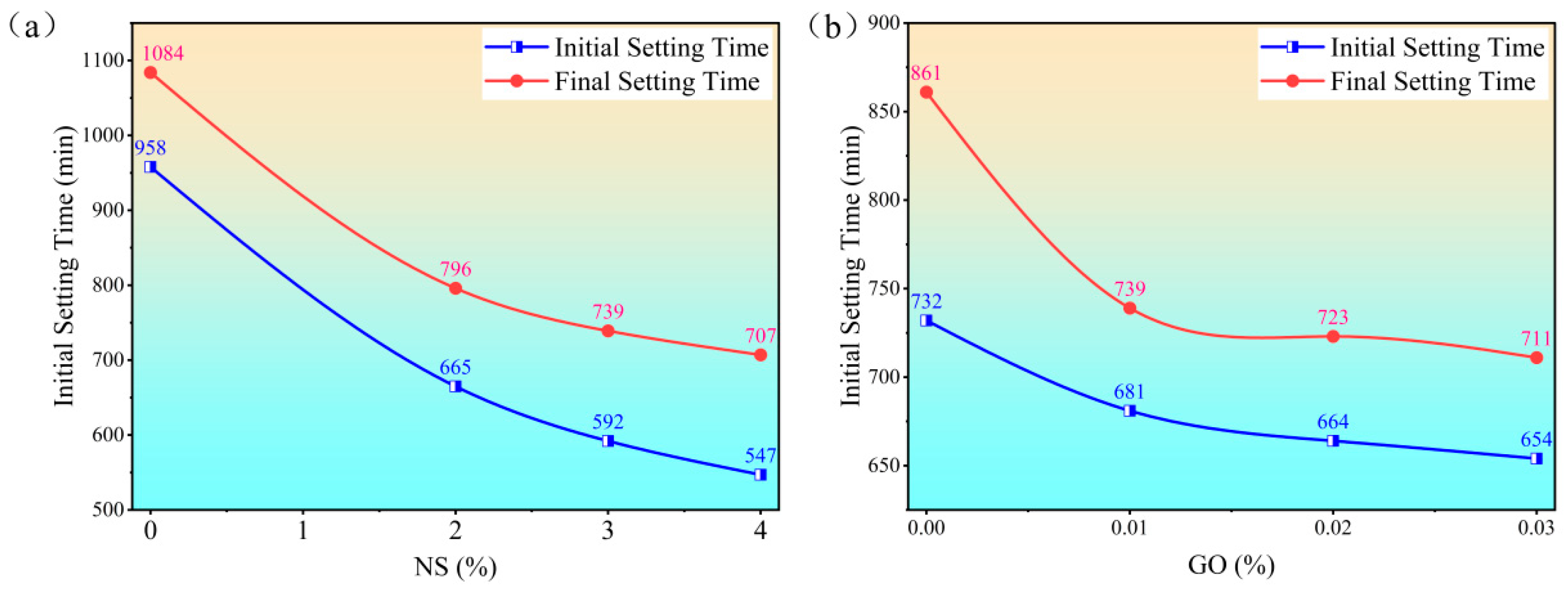 - Fresh State Properties: Both NS and GO significantly accelerated the setting time of cement paste and effectively reduced the bleeding rate. However, NS had a more detrimental impact on fluidity compared to GO. The hybrid system further shortened the setting process and improved stability, albeit at the cost of a more substantial reduction in fluidity.