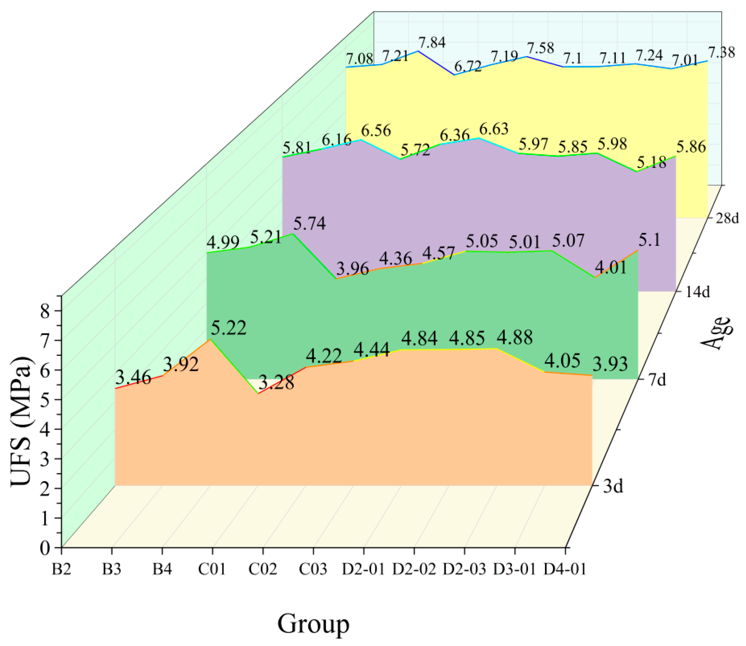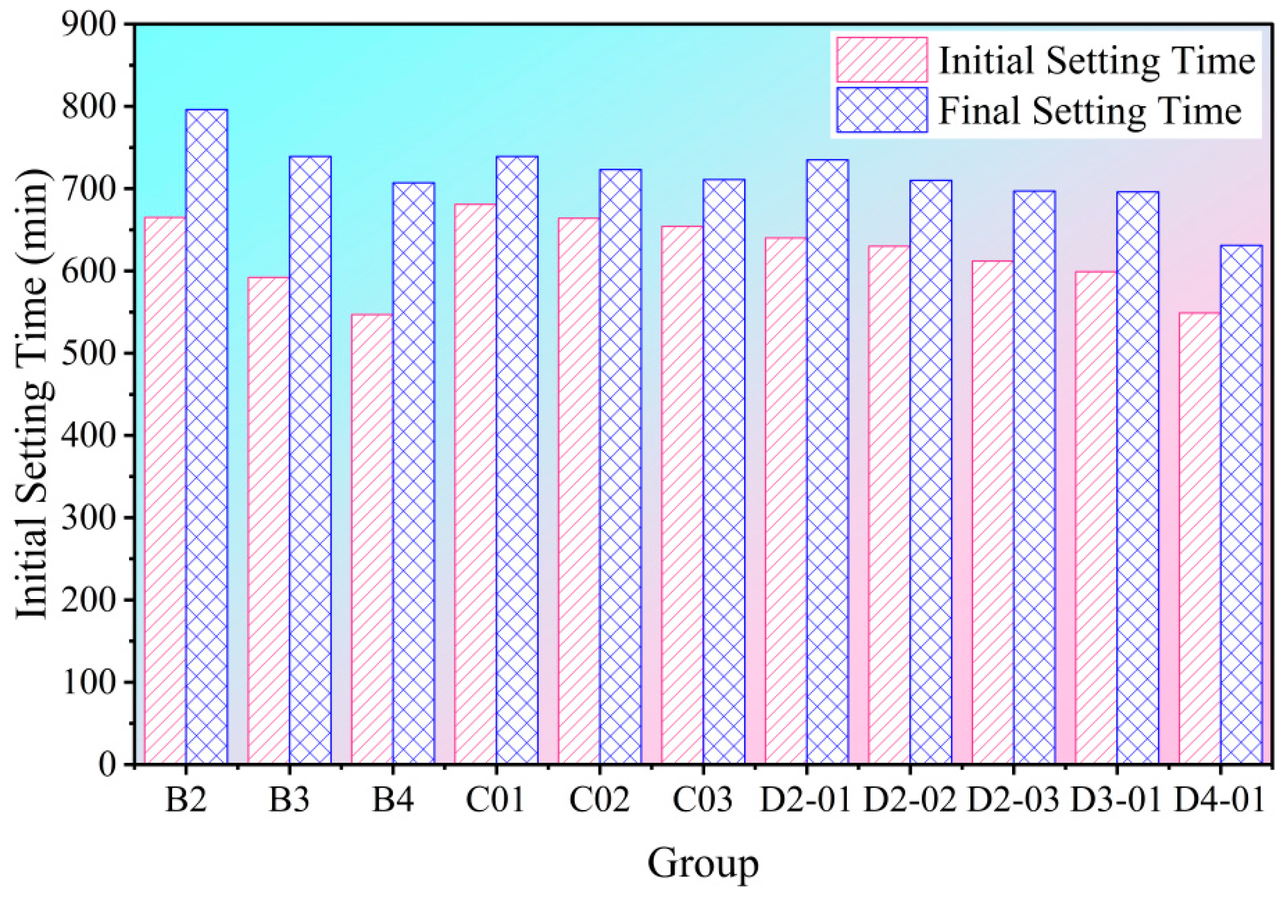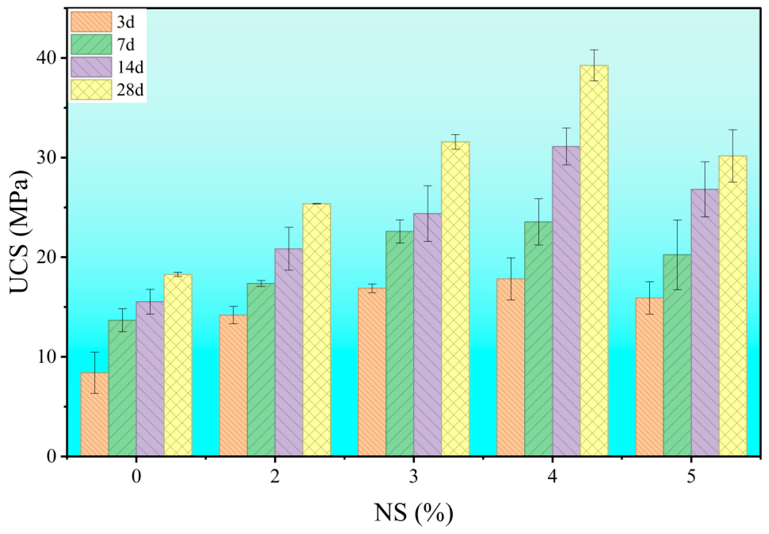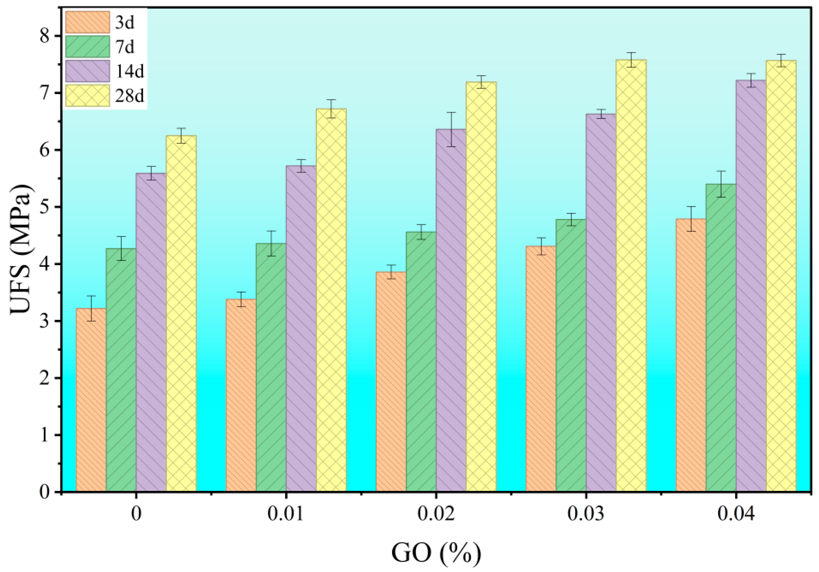 - Fresh State Properties: Both NS and GO significantly accelerated the setting time of cement paste and effectively reduced the bleeding rate. However, NS had a more detrimental impact on fluidity compared to GO. The hybrid system further shortened the setting process and improved stability, albeit at the cost of a more substantial reduction in fluidity.