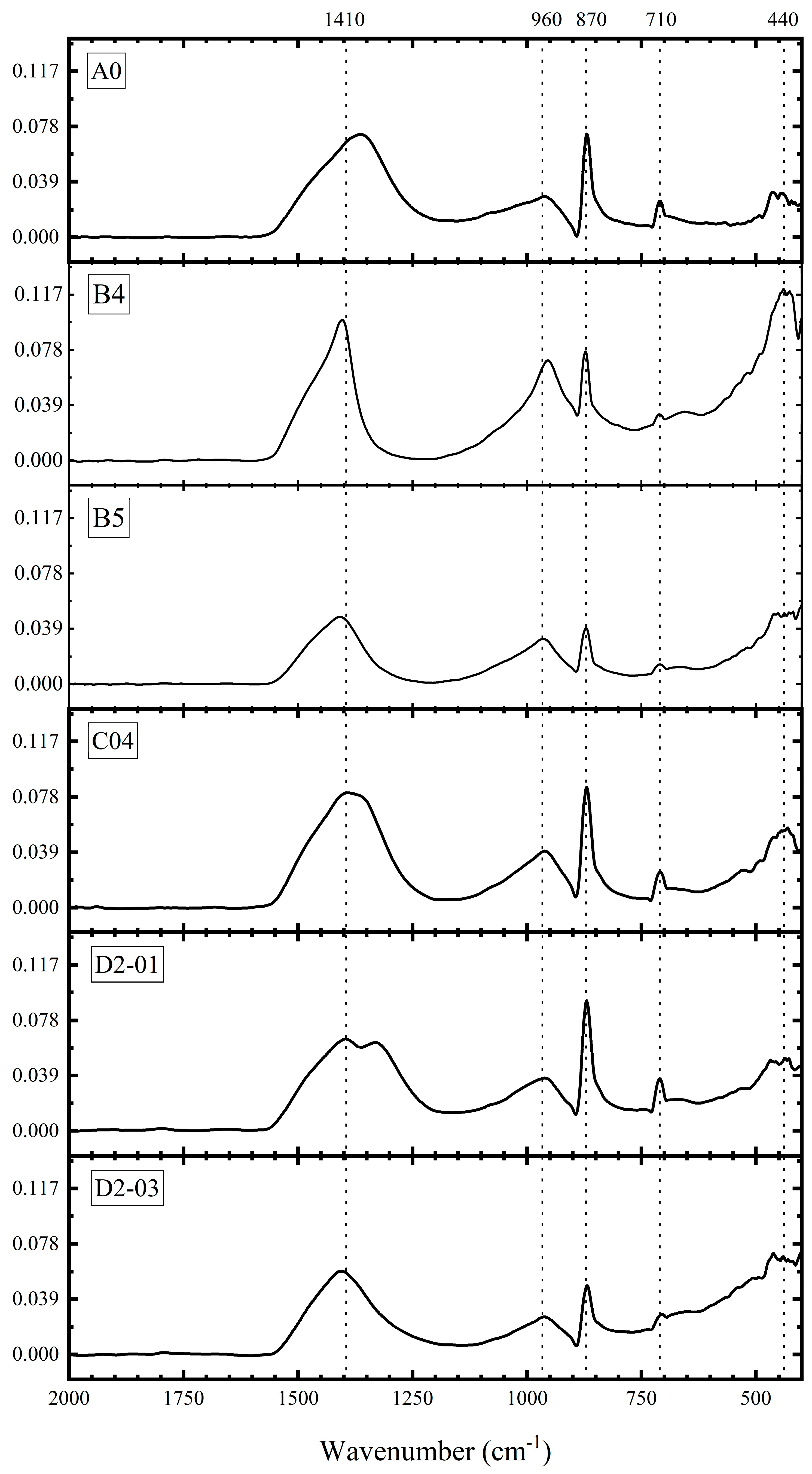 ~710 | C–O in-plane bending | Calcium carbonate (CaCO3) |