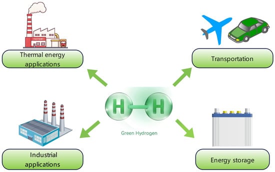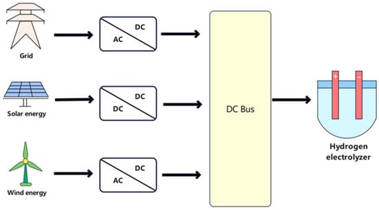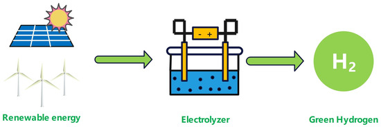 Hydrogen energy is a storable, electrochemically convertible, and combustible clean energy source characterized by high mass-to-energy density, zero carbon emissions, and broad application potential. These attributes make hydrogen energy crucial for mitigating climate change and establish it as a leading sustainable energy solution for the 21st century [4]. Hydrogen can be produced through various methods. For example, hydrogen obtained via steam methane reforming or gasification is classified as “gray hydrogen.” When steam methane reforming is combined with carbon capture technology, the product is termed “blue hydrogen,” while hydrogen generated through methane pyrolysis is referred to as “turquoise hydrogen.” As shown in Figure 1, hydrogen produced through water electrolysis powered by renewable sources such as solar and wind energy is referred to as “green hydrogen,” an environmentally friendly alternative with a negligible carbon footprint [5].