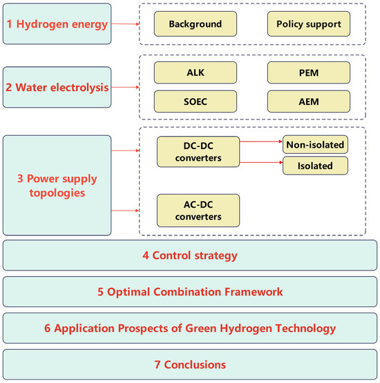 The structure of this paper is illustrated in Figure 2. The first section presents the overall background of hydrogen energy and reviews relevant domestic and international policies. The second section discusses four methods of hydrogen production via water electrolysis. The third section classifies and analyzes various types of power topologies. The fourth section examines control strategies for water electrolysis-based hydrogen production. The fifth section proposes the concept of an optimal combination framework. Finally, the paper discusses the application prospects of green hydrogen technologies. To aid the reader, Table 2 is provided below, compiling the definitions of technical acronyms, material compositions, and performance metrics that recur in the subsequent sections.
