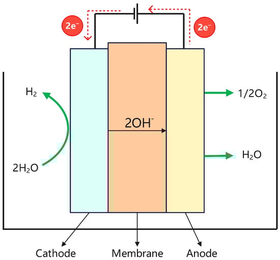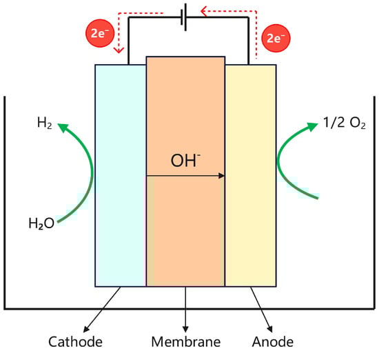 Alkaline water electrolysis is an electrochemical process that decomposes water into hydrogen and oxygen under the application of an electric current. The electrolyte typically consists of an aqueous solution of potassium hydroxide (KOH) or sodium hydroxide (NaOH). Owing to its technological maturity, cost-effectiveness, and scalability, this method has been widely employed in industrial hydrogen production [18]. As illustrated in Figure 3, hydroxide ions (OH−) act as the primary charge carriers within the electrolyte of an alkaline water electrolyzer. The electrolyzer consists of an anode and a cathode, and the corresponding electrochemical reactions are as follows: