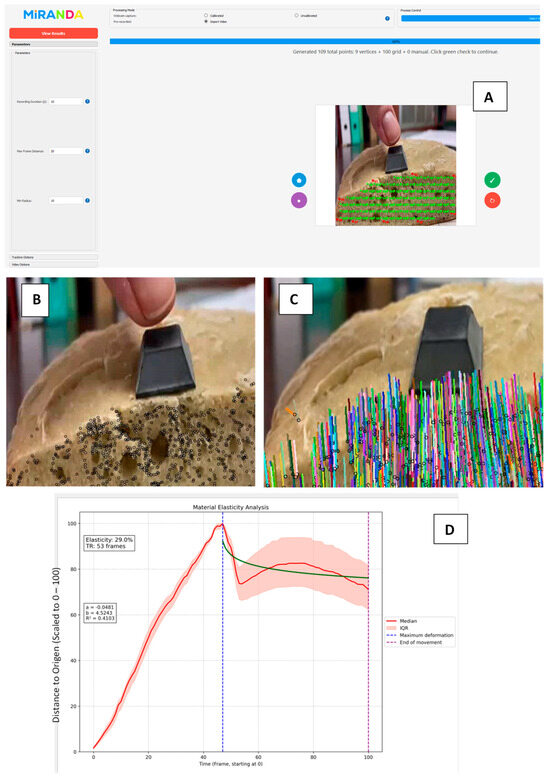 For instance, viscoelastic foam (demonstrating nearly 100% elastic behavior) and kinetic sand (approximating 100% plastic behavior) were specifically observed to characterize the extremes of viscoelastic response, with MIRANDA quantifying their distinct “perception units” during the creep-recovery cycles. In Figure 3, the process of analyzing a soft material using MIRANDA is concisely illustrated. This procedure involves observing the material’s movement and deformation under an applied force for a specified duration (e.g., 20 s or as required by the experiment). This deformation can be applied manually or, to ensure optimal repeatability and consistency, a robotic system such as RELAPP can be employed, which exerts a controlled and uniform force over time. This is an example with a complex material (rustic bread): Figure 3A displays MIRANDA’s central interface, showing the rustic bread sample under observation with the specific region of interest highlighted.