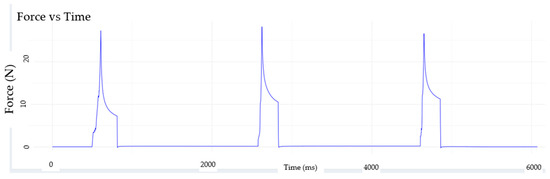 Visualization of the deformation captured by RELAPP sensors for a strength type wheat flour dough (alveographic force, W = 262) during the creep phase using software RELAPP ANALYZER developed to analyze viscoelasticity properties using RELAPP sensor. The Y-axis represents the material’s resistive force (N), while the X-axis denotes time (milliseconds). This is illustrated in a compactibility test, comparing the undeformed material (left) with the material that has been previously deformed twice (right) during three Creep-Recovery Tests programmed in the robot.