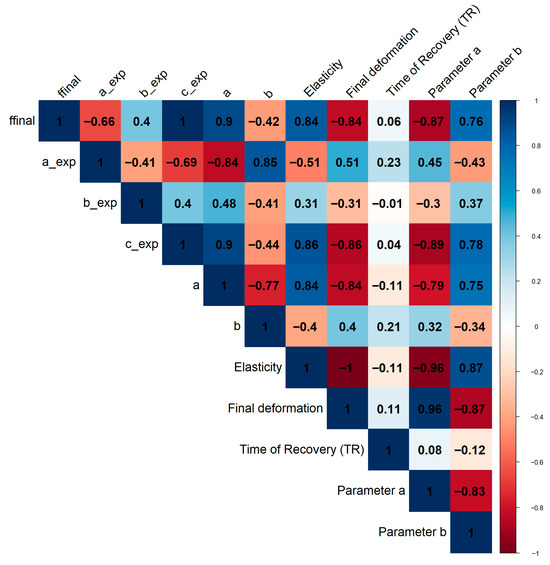 The strongest positive correlations were observed between ffinal and Elasticity (0.839), and even more so between c_exp and Elasticity (0.858). This suggests that a higher final resistive force during the creep phase and a larger value for the c_exp parameter of model m1 are strongly linked to a greater geometric elasticity and deformation recovery during the recovery phase.