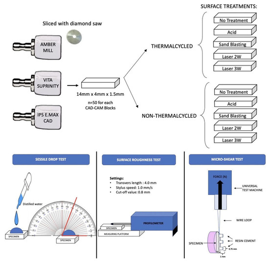 The experimental design of this study is depicted in Figure 1. From each Lithium Disilicate CAD-CAM block, 50 specimens (in total 150) were wet-sliced (IsoMet 5000, Automatic Precision Sectioning Machine, Buehler Ltd., Seoul, Republic of Korea) into rectangular plates (14 mm × 4 mm × 1.5 mm). Only one surface of each plate was wet polished with 400-grit followed by 600-grit abrasive silicon carbide paper with a grinder and polisher device (MetaServ 250, Buehler Ltd.) for 15 s. A digital calliper was used to arrange the final thickness to 1 ± 0.01 mm of each plate. All specimens were washed with distilled water and air-dried to remove any surface waste and subjected to the crystallization firing process, according to 101 the manufacturer’s recommendations. A total of 50 specimens of AM, 50 specimens of vs. 102 and a total of 50 specimens from IPS was obtained.