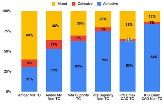 The distribution of failure types in adhesive resin cement samples is presented in Figure 2, and representative stereomicroscope images are shown in Figure 3. Adhesive failure, defined as separation at the resin–ceramic interface, was the predominant failure mode across all groups and was more frequent in specimens that did not undergo thermocycling. The highest incidence of adhesive failure was observed in the IPS e.max CAD material without thermal cycling, while the lowest incidence of adhesive failure was observed in the Amber Mill material with thermal cycling. Cohesive failure, known as fractures within the resin composite itself, was least observed in the IPS emax CAD group that did not undergo thermal cycling, while the highest incidence of cohesive failure was detected in the Amber Mill material that underwent thermal cycling.